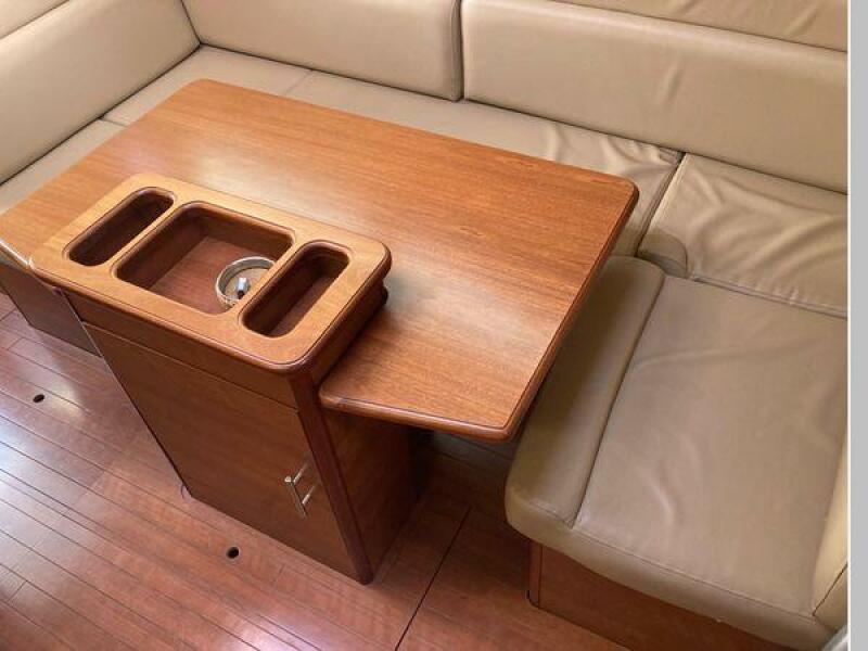 In the salon, the port side settee features Hunter’s unique easy flip navigation table. One effortless flip reveals Hunter’s apple iTech docking station – your gateway to music, television programming, and blockbuster movie hits. Your iphone or ipod slips securely into this dock, and your ipad can easily cable into this port as well. This dock will charge your Apple devices, but that’s just the beginning. Play your favorite songs from your iphone or ipod itunes library both in the salon and in the cockpit, no matter where you are on the water.