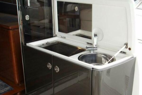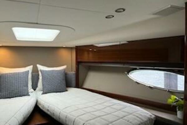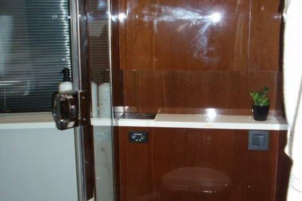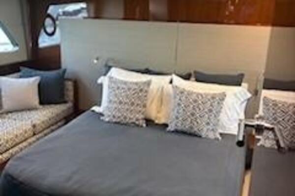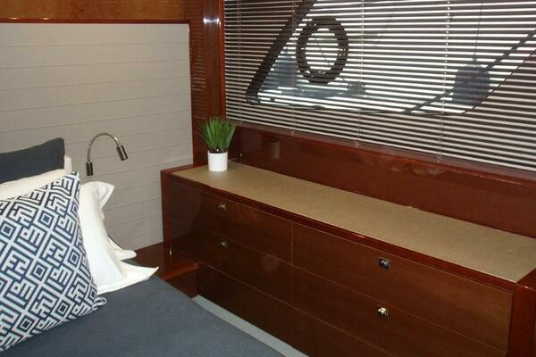 The spaciousness continues in the aft master suite. Substantial windows and 6 feet of headroom give it a sense of expansiveness, while the full beam allows for a lounge, full-size bed and large dresser. An en-suite head has an enclosed shower, Dometic toilet and signature Perrin and Rowe ceramic sink. Princess used Avonite composites to good effect on the galley countertops as well as the head soles. Her VIP suite, with scissor berths that open up the space, also has 6 feet 7 inches of headroom. It connects to another large, full-feature head doing double duty as a day-head, with a separate door to the galley.