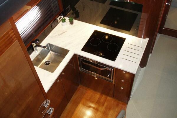 Princess incorporates many tactile and visual details like leather pieces on cabinet knobs, faux textured leather on rails and small, backlit pillars inside of a drawer where the china is stowed. Princess uses the same components and hardware as on its X95. It shows in features like galley drawers on tracks that close softly instead of slamming. The woodwork is beautiful and meticulously finished, with leather and stone accents that add substance rather than glitz.