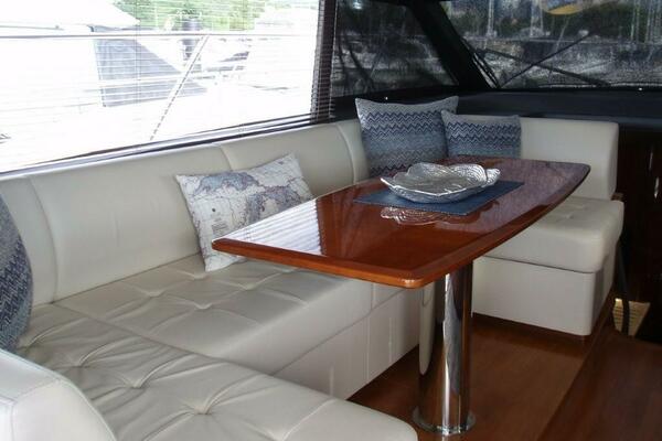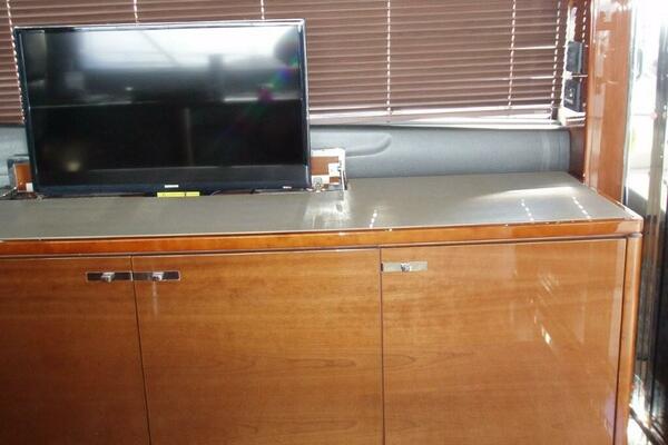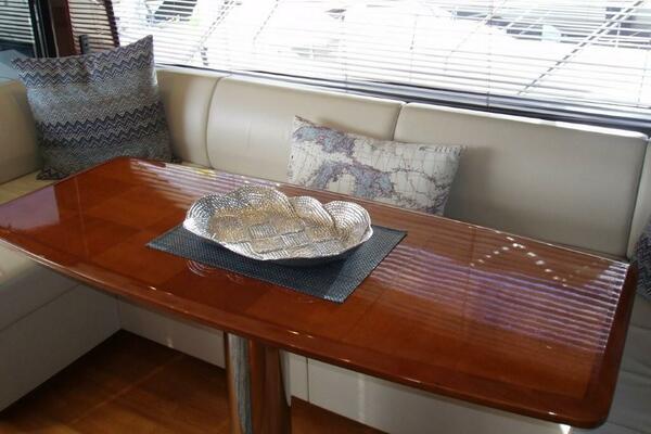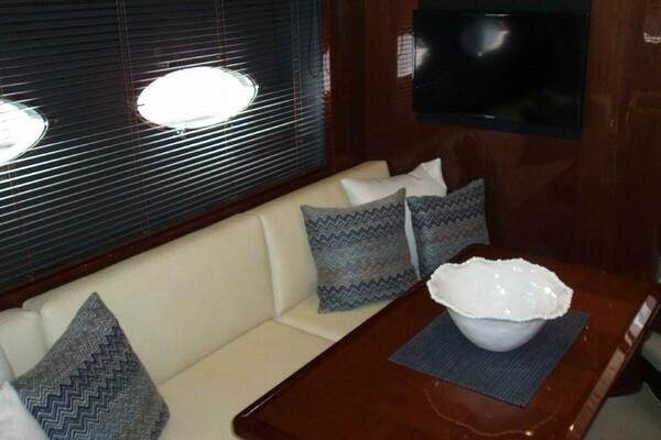 The salon, with a lounge to port and console (with a pop-up TV and entertainment center) to starboard, was made for socializing.