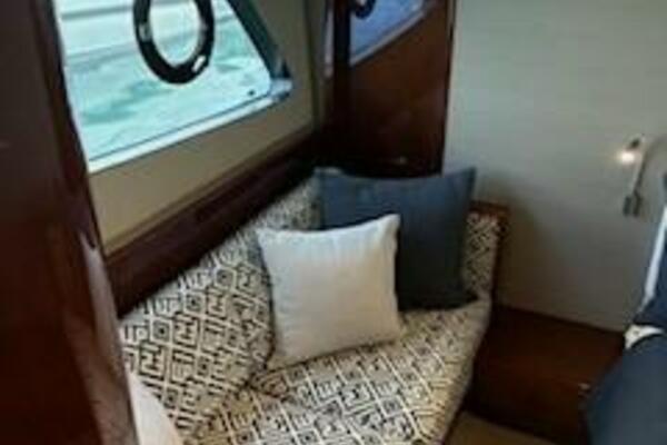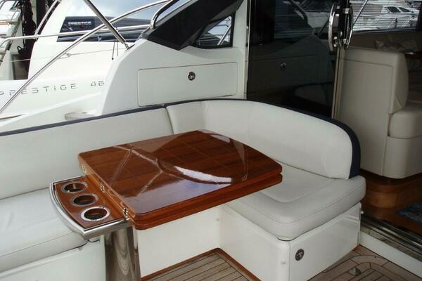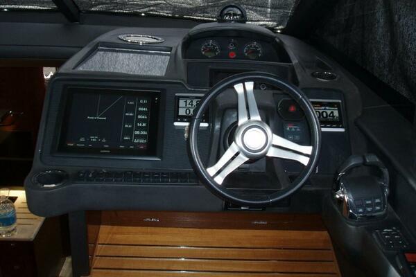 Princess designed the helm as an all-weather station that can be buttoned down in rough weather or opened up on warm days. A large sunroof slides open, and the driver’s side has an opening window for ventilation. Her helm has a double seat- two bucket seats abutting each other- that makes a stylish alternative to a bench seat setup. The helm station is well laid out with good visibility through the windshield and side windows.
