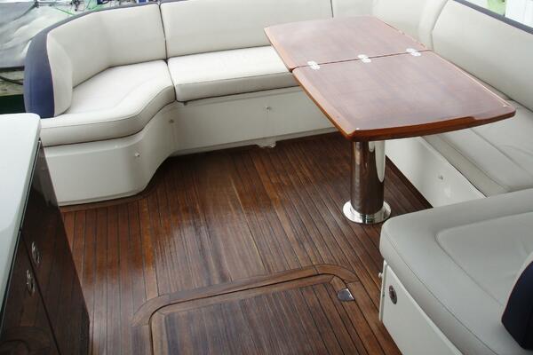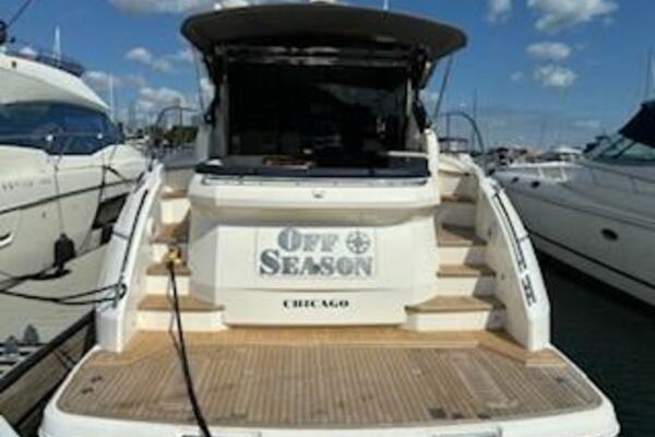 The V48 also has a teak swim platform with hydraulic lift to float the tender (up to 11 feet length overall, 880 pounds) into the water. Her transom features a sizable stowage locker. This vessel’s cockpit is accessed from the starboard side of the swim platform via three steps and a 21-inch-wide door; the steps on the port side lead directly to the port deck.