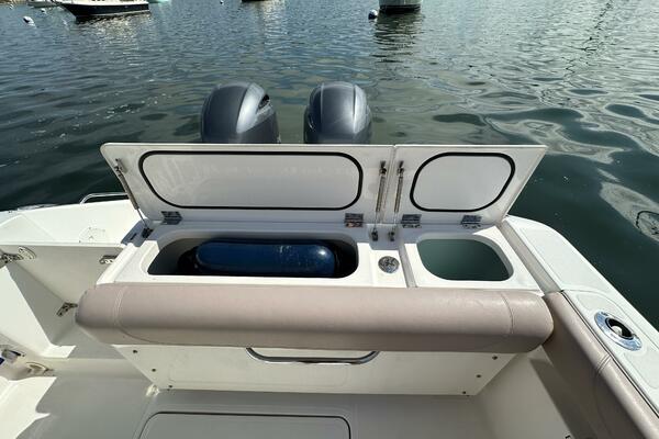 - Fixed aft-facing seat with hinged bottom cushion and insulated fiberglass cooler
