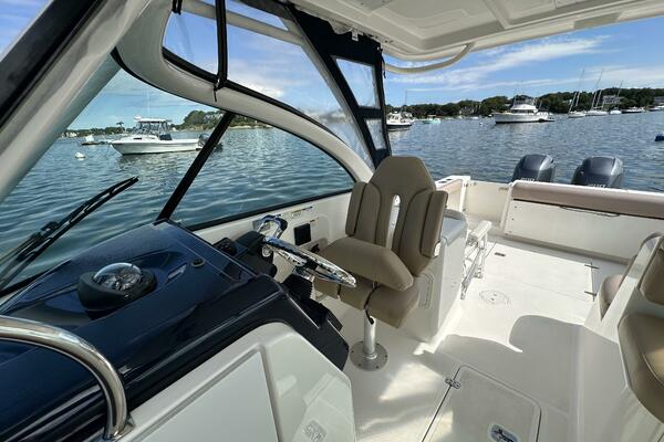 - Custom helm seat with acrylic cap backrest and flip-up bolster, adjustable and swivels toward aft