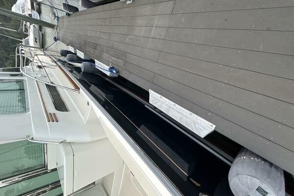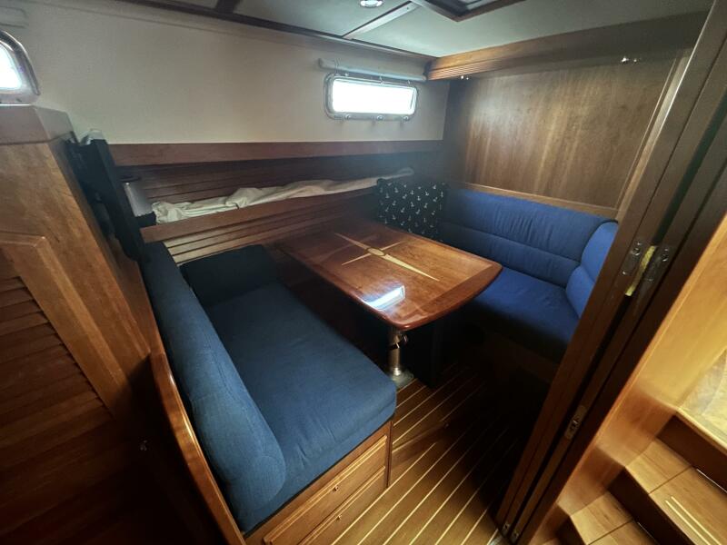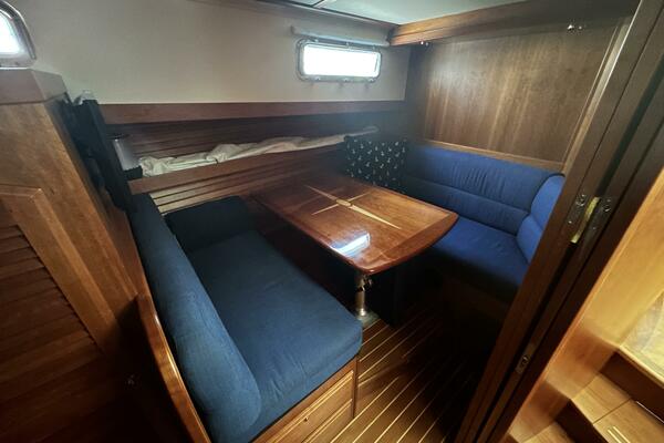 Down two steps to the dinette, with two double banquettes and hi lo table, which convert to a full size guest bed. Large cedar locker, fixed Oceanair overhead hatch with translucent lens, stainless steel opening portlight. Double pocket doors assure privacy when needed. Samsung television viewable from dinette or galley, Jensen dvd/mp3 player.