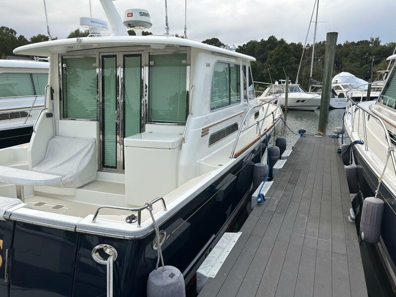 Easily board this beautiful, like new in every way, Sabre 42 Salon Express via the oversized swim platform through the offset transom door to the roomy cockpit with seating for 6 on the L shaped settee, custom cherry table, rear facing double seat forward, never used grill and Raritan ice maker. Molded steps allow easy access to wide walkways port and starboard to the fore deck. Pod access and plentiful storage accessed through hatches in the sole. Separate sound system. Enter into the saloon through the stainless steel bifold door.