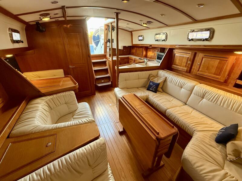 - Saloon: Features 6'4" headroom, C-shaped port settee (convertible to a berth), two starboard club seats, a drop-leaf dinette table with center storage, and cream Ultraleather cushions.