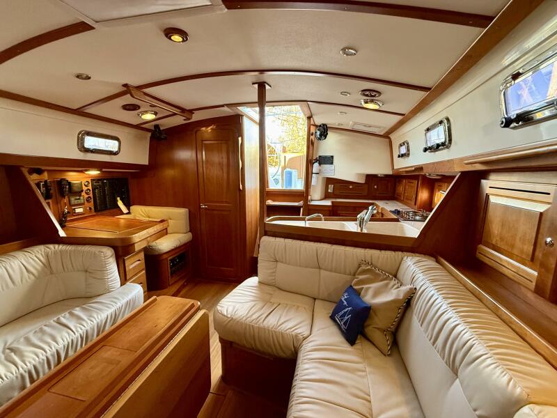 - Nav Station: Forward-facing navigation station to starboard, equipped with electrical panels and electronics.