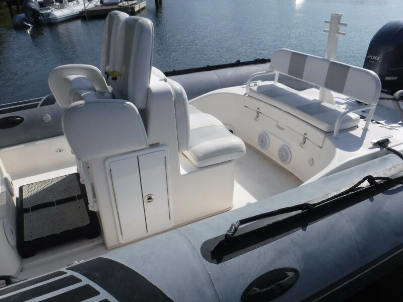 *Safe and stable for family fun or rugged and reliable as a work boat. CUSTOM heavy duty aluminum I-beam Integrity trailer Included. *A unique blend of functionality and comfort, this Zodiac Pro sports twin low hour Yamaha 200HP engines tied into ** Helm-Master joystick ** and Electronic Power Steering (EPS) for amazing maneuverability Cruise 35, wide open 55 mph *A nice suite of Garmin Electronics and full head with storage throughout completes this rugged Rigid Hull Inflatable. * These boats have been used as tenders for America’s Cup vessels and functioned as durable transport for numerous expeditions Specifications • Length: 27' 11" • Beam: 9' 10" • Hull Weight: 2976 lbs • Motor Weight: 562 lbs each • Capacity: (20) Persons or 6173 lbs • Tube Diameter: 24" • Separate Air Chambers: (7) • Underdeck Fuel Tank with 140 Gallon Capacity • Fabric Type: CSM-Hypalon • Slide-On Tube System Factory Standard Hull / Tube Features • Deep V Fiberglass Hull • Self-Draining Molded Non-Skid Deck • Anchor Locker • Bow D-Ring • High Profile, Double Rubbing Strake • Removable Tubes for Easy Storage, Repair or Replacement Standard Features • Under Deck Wire Harness Routing • Navigation Lights • Foot Pump • Repair Kit • (2) Paddles • Optimum Step Down Into Hull Console • Command Center Bolster • Aft Bench Seat and Bow Cushion • Fuel / Water Separator • Transom Tie Downs • Battery Cut-Off Switch and Battery Box • Command Link Plus LCD Display Electronics • Garmin VHF • Fusion stereo with 4 speakers • Garmin 17 Inch Display with Garmin Radar • LED Lights • Garmin HD Radome
