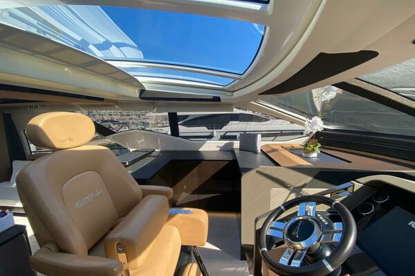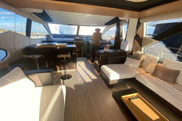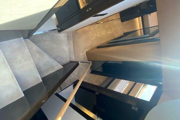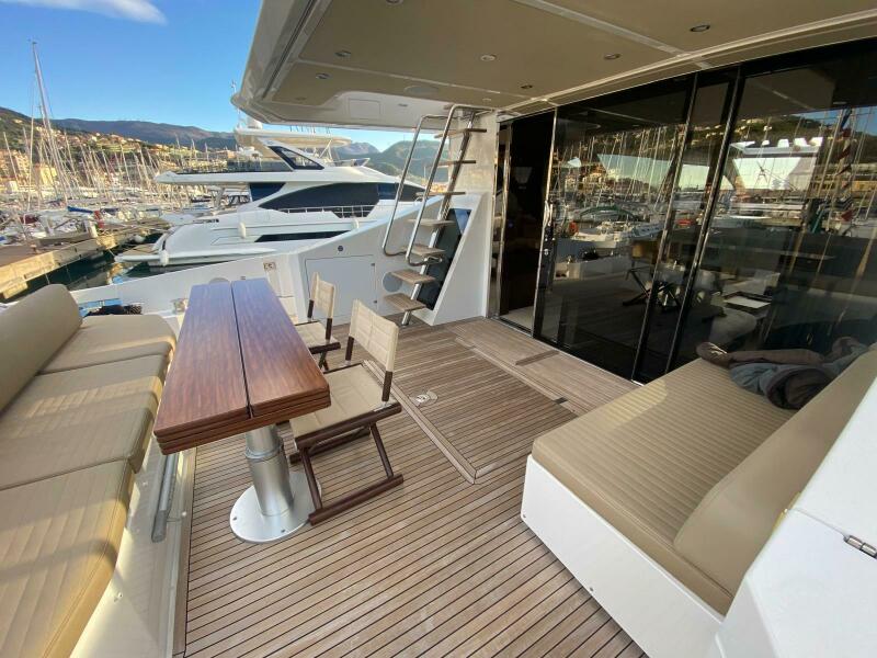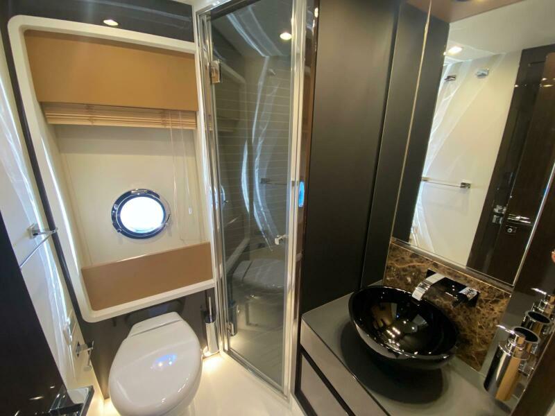 From the moment you approach this Azimut 77S, you’ll notice the streamlined lines and sport-fly silhouette that distinguish it from typical motor-yachts. Her triple IPS pod drives (by Volvo Penta) deliver responsive handling, efficient power and simplified docking. Large side windows and the optional hard-top sunroof flood the main deck with light and create a seamless indoor-outdoor connection. The aft cockpit transitions into a wide hydraulic swim platform, perfect for launching the tender or enjoying water sports. Forward you’ll find a generous bow lounge area for sunbathing or casual cocktails, and the flybridge serves as the ultimate vantage point for cruising or entertaining.
