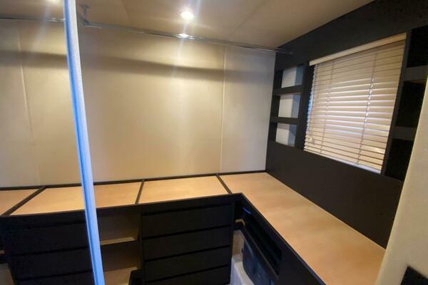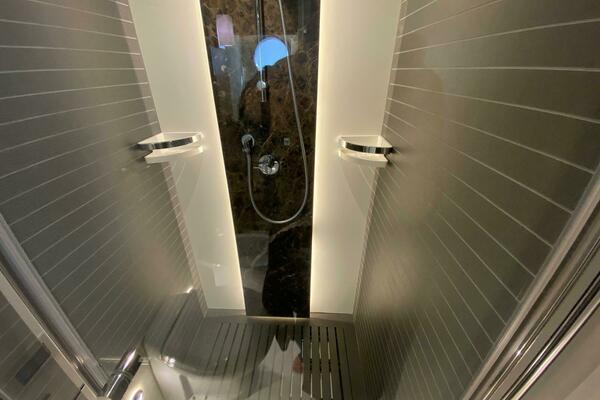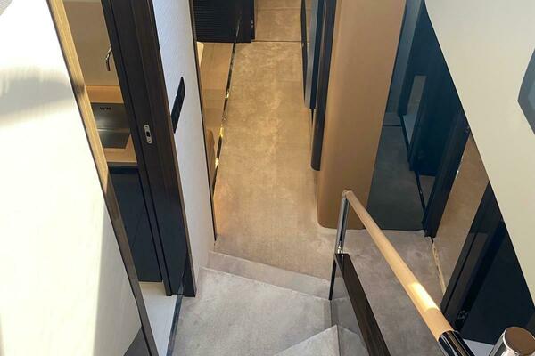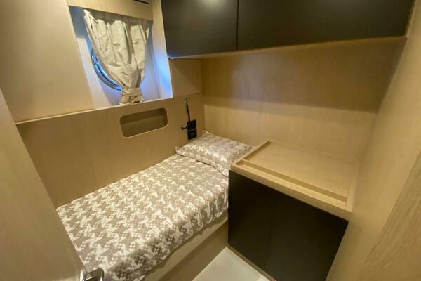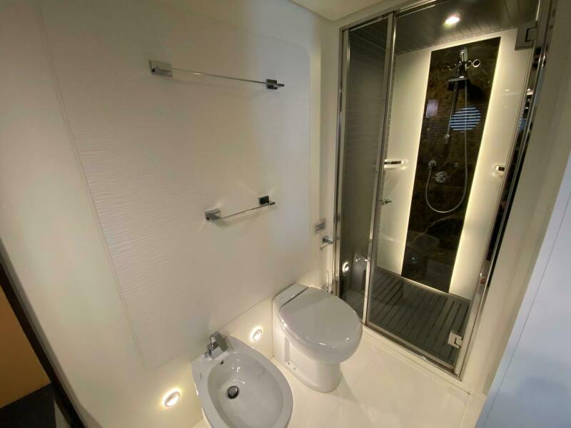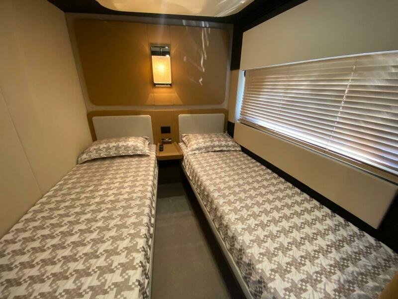 Inside the lower deck you’ll discover four beautifully appointed guest cabins, each offering en-suite facilities. The full-beam master suite features premium finishes, abundant storage and a spa-style bath. A VIP cabin and twin guest cabins support flexible arrangements for family or charter use. The main salon is dressed in fine materials, with sleek wood finishes, ambient lighting and commanding views through full-height glazing. The galley is well equipped and discreetly positioned, enabling effortless service while maintaining the ambiance. Crew quarters aft provide separation for guest comfort and practical operations.