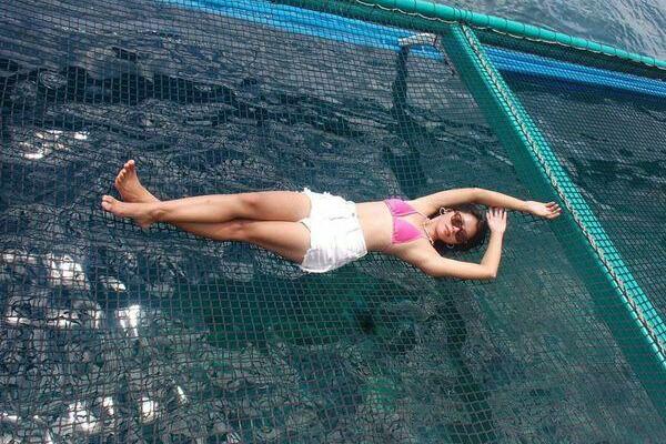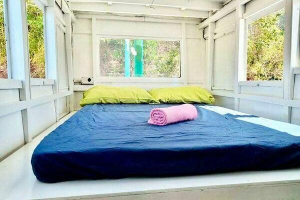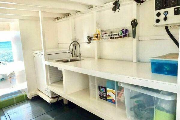 She was completely refitted in 2018 for specific purposes: island hopping or river cruises, as well as private or commercial culinary cruises, as she has a fully equipped commercial galley. Westerners will ask about the funny shape. She has a 31” draft. That means she motors comfortably in 3’-6’ of water which is ideal for diving trips, sightseeing around coral reefs, and the long bow plank allows for easily beaching her and walking off to the land or sand without getting wet. This means you can pull up to a resort, load 20 people on deck for fine dining, take them for a sunset dinner cruise, and have them back before bedtime. Or if you’d rather head upriver or explore islands with a few couples, you will all have your own rooms. Lie around on the six trapeze and zone out watching the fish and reef below. A large fridge and freezer keep the food and drinks cool and/or frozen, all powered by large solar panels. No shore power needed.