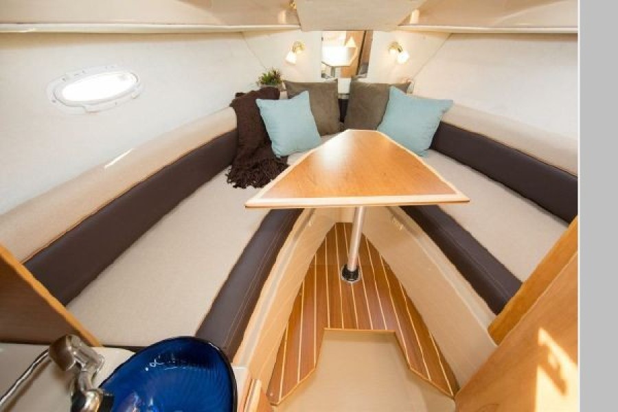 The style and innovation cues continue inside the Cutwater 24 starting with an opening aft bulkhead and reversible dinette seat that provides additional cockpit seating and truly invites the outside in. There is plenty of light in the salon from the opening, transparent roof hatches and sliding side windows. The beautiful interior of the C-24 features abundant Maple and Cherry cabinetry and shelving in the galley as well as the private forward stateroom. Heavy gauge Sunbrella fabrics wrap all interior seats for maximum comfort and durability. The mood is set in the salon and forward cabin with aircraft-style, indirect LED lighting.