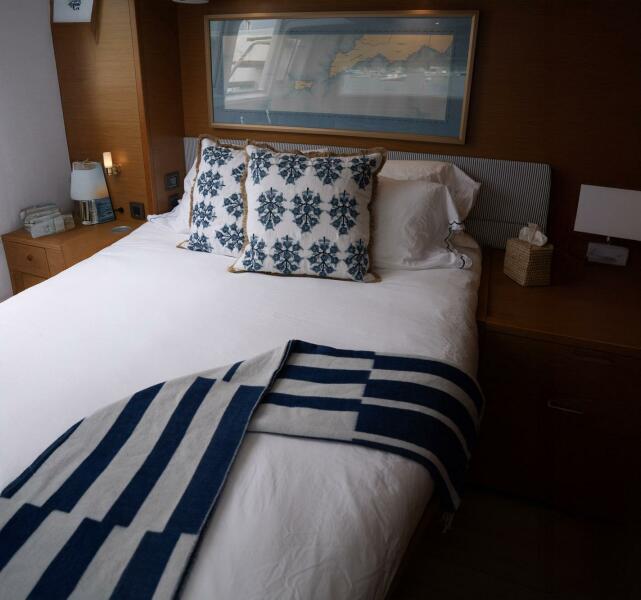 On the starboard side, the master suite has also been substantially modified, with a washroom now placed aft on either side of the cockpit access stairs, making room for a large cupboard space in the bedroom. The forward starboard cabin, now a real V.I.P. suite, also benefits from this change due to the volume freed up by the repositioning of the master washroom.