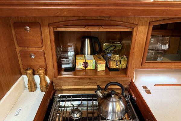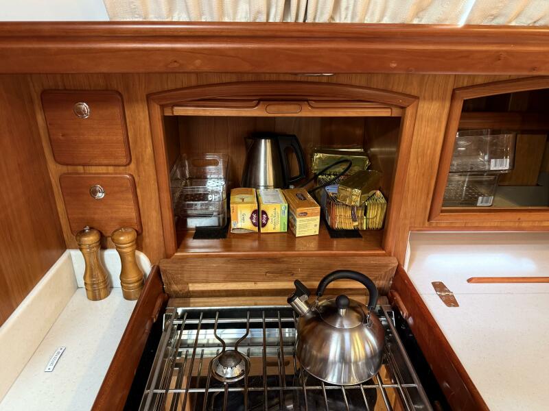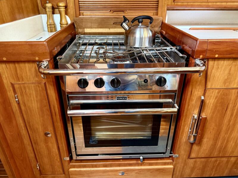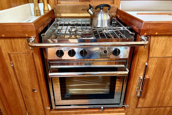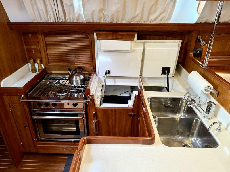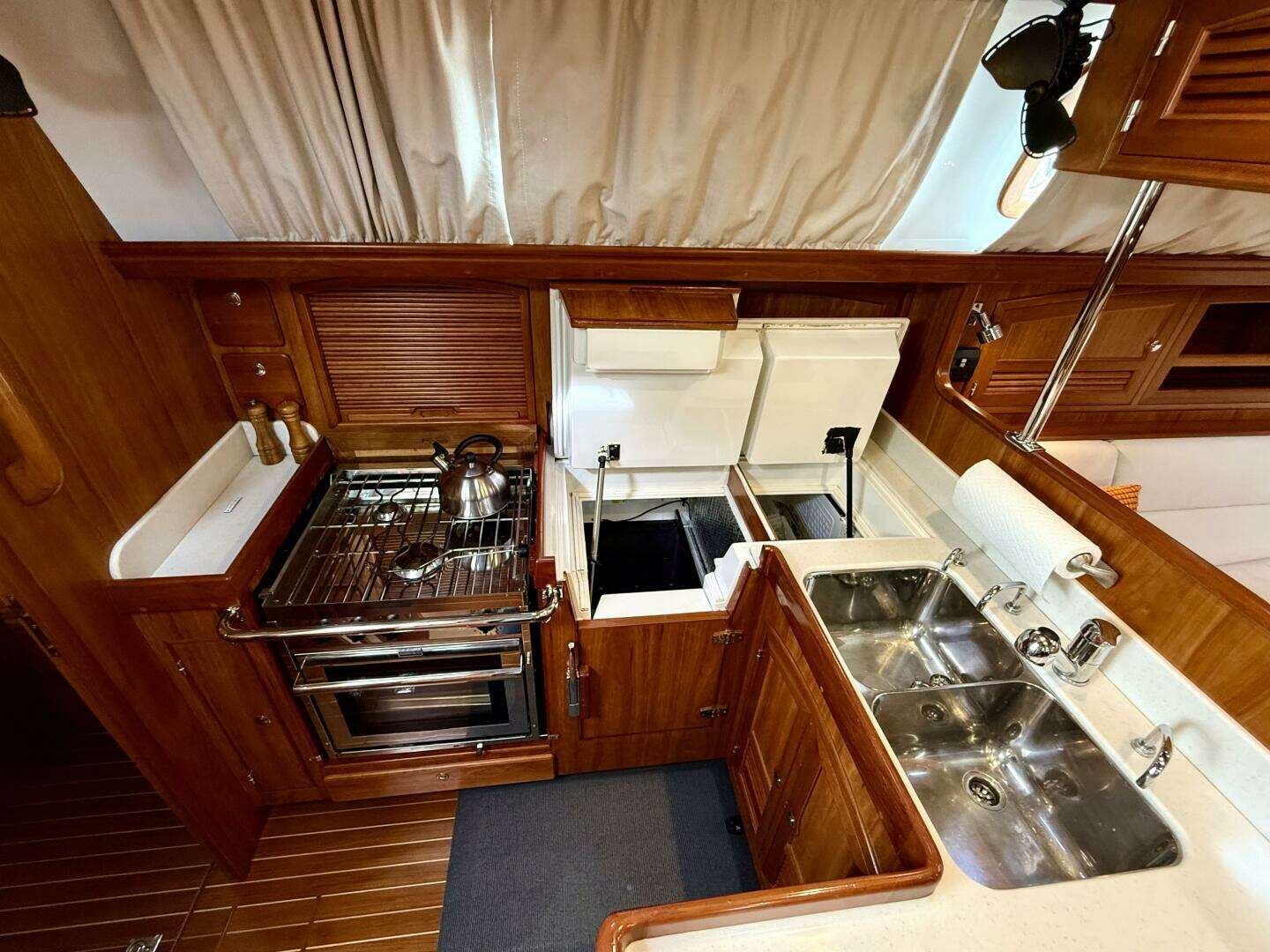 - Galley: A U-shaped galley provides a safe space for offshore cooking, with a centerline double stainless steel sink, gimbaled three-burner stove, and ample storage.
