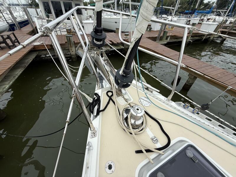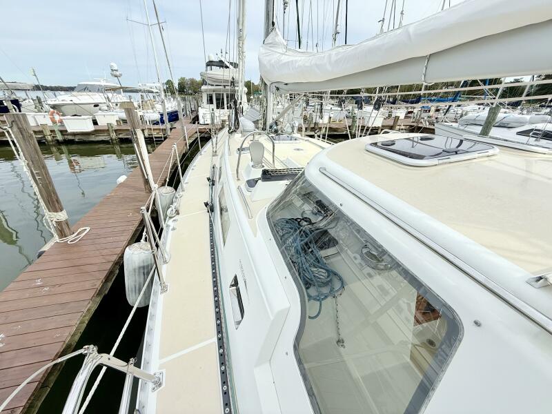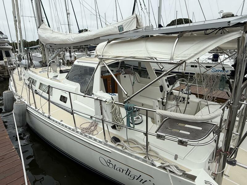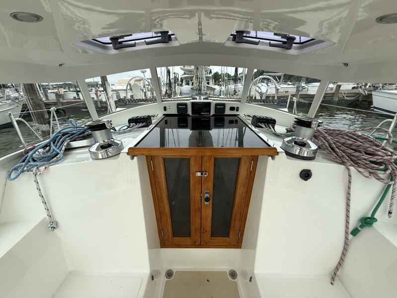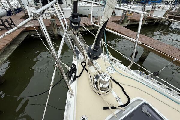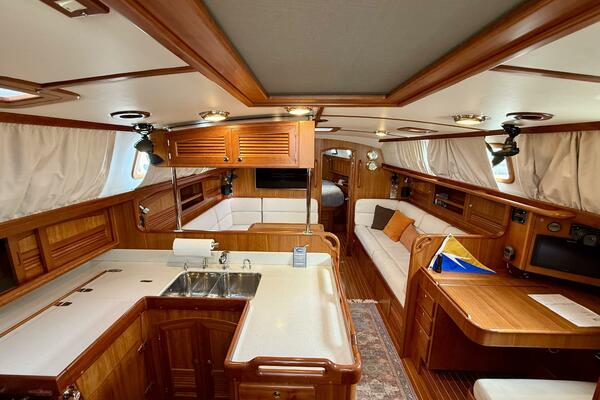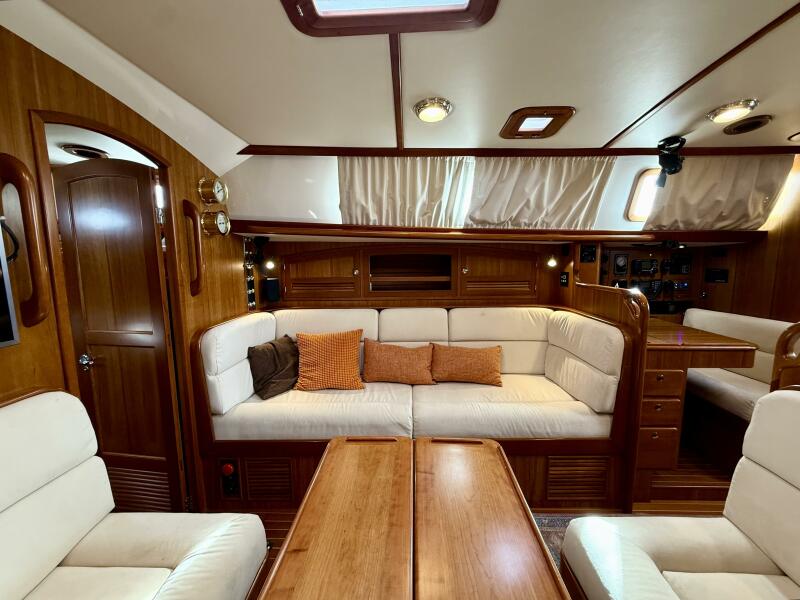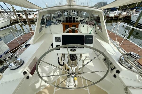 - Cockpit: The deep, secure, T-shaped aft cockpit provides excellent protection and visibility. It features long seating, a walkthrough transom, and extensive storage, including a dedicated liferaft locker. A hard dodger with safety glass was a popular optional feature.