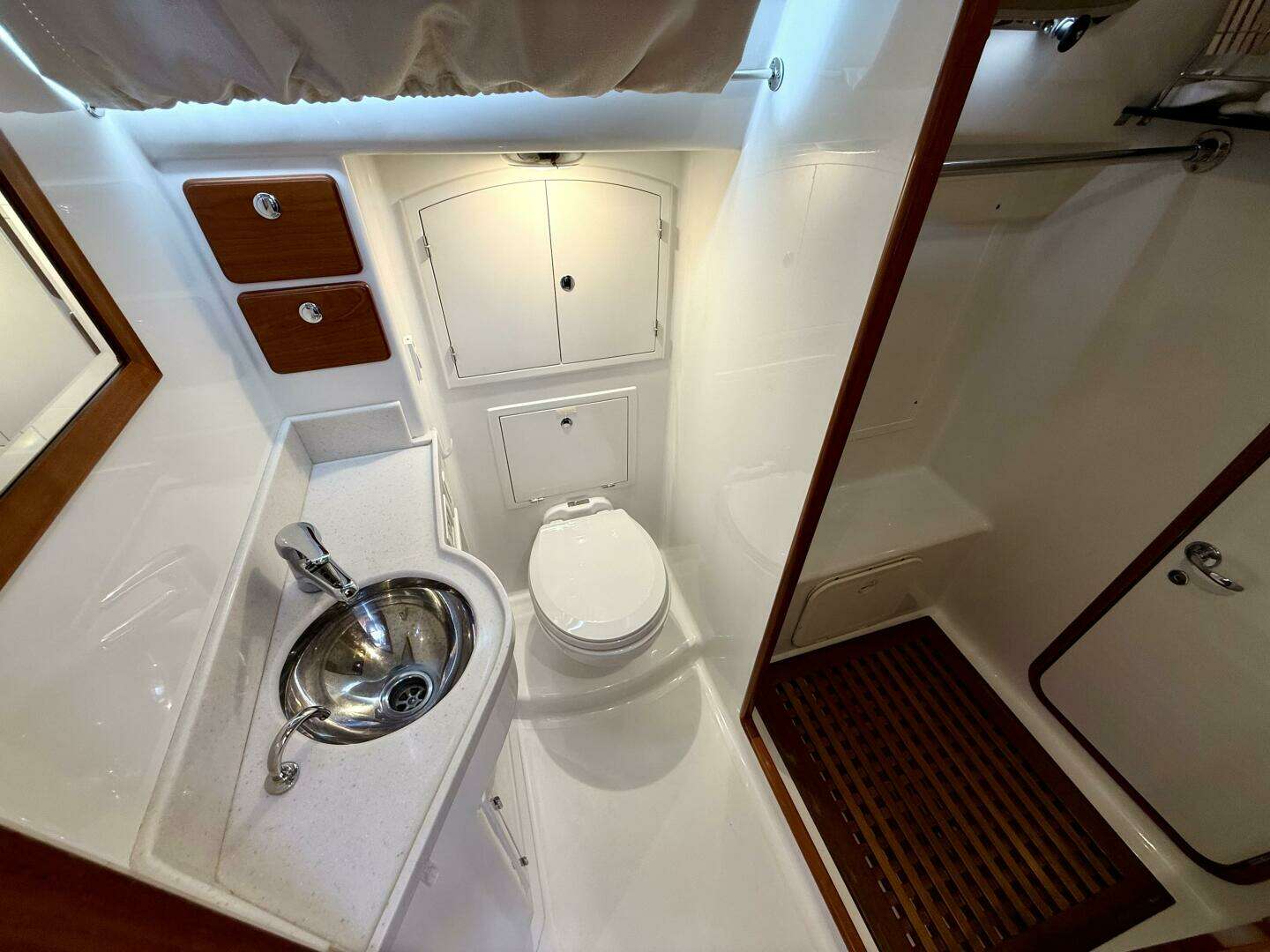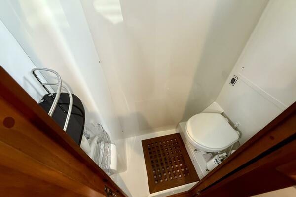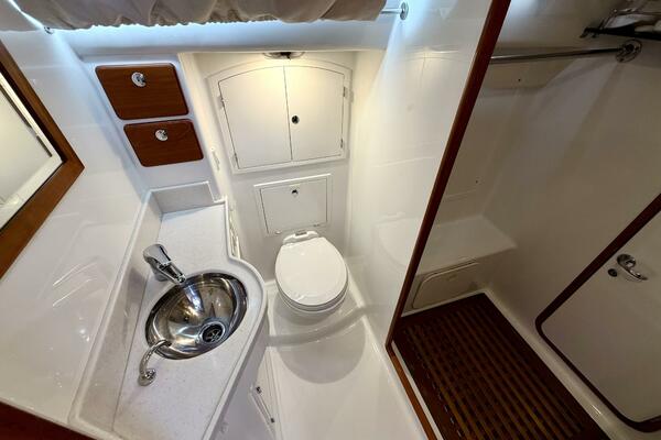 - Nav station: A forward-facing nav station provides a functional workspace for charts and electronics, with easy access to the AC/DC breaker panel.