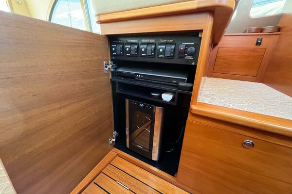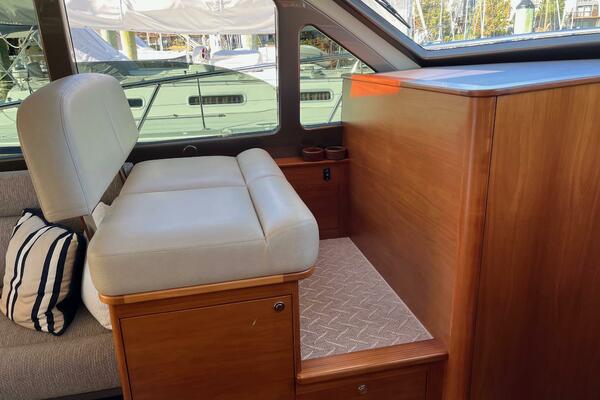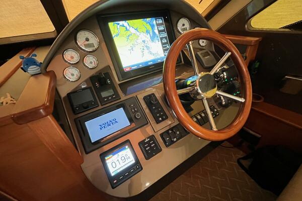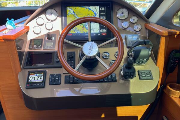 - Ergonomically designed helm station, electronic instrument panel, teak steering wheel and custom helm seating