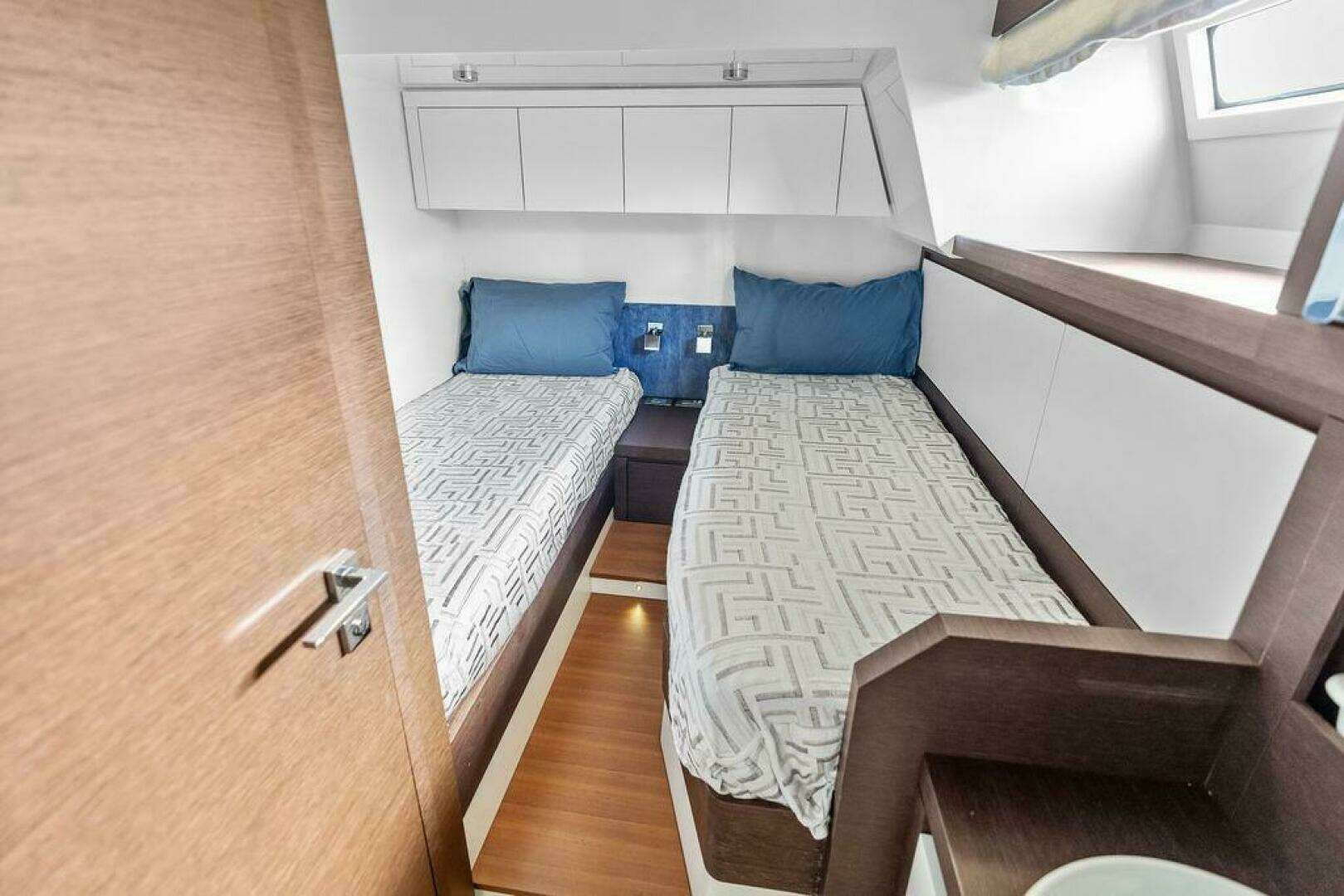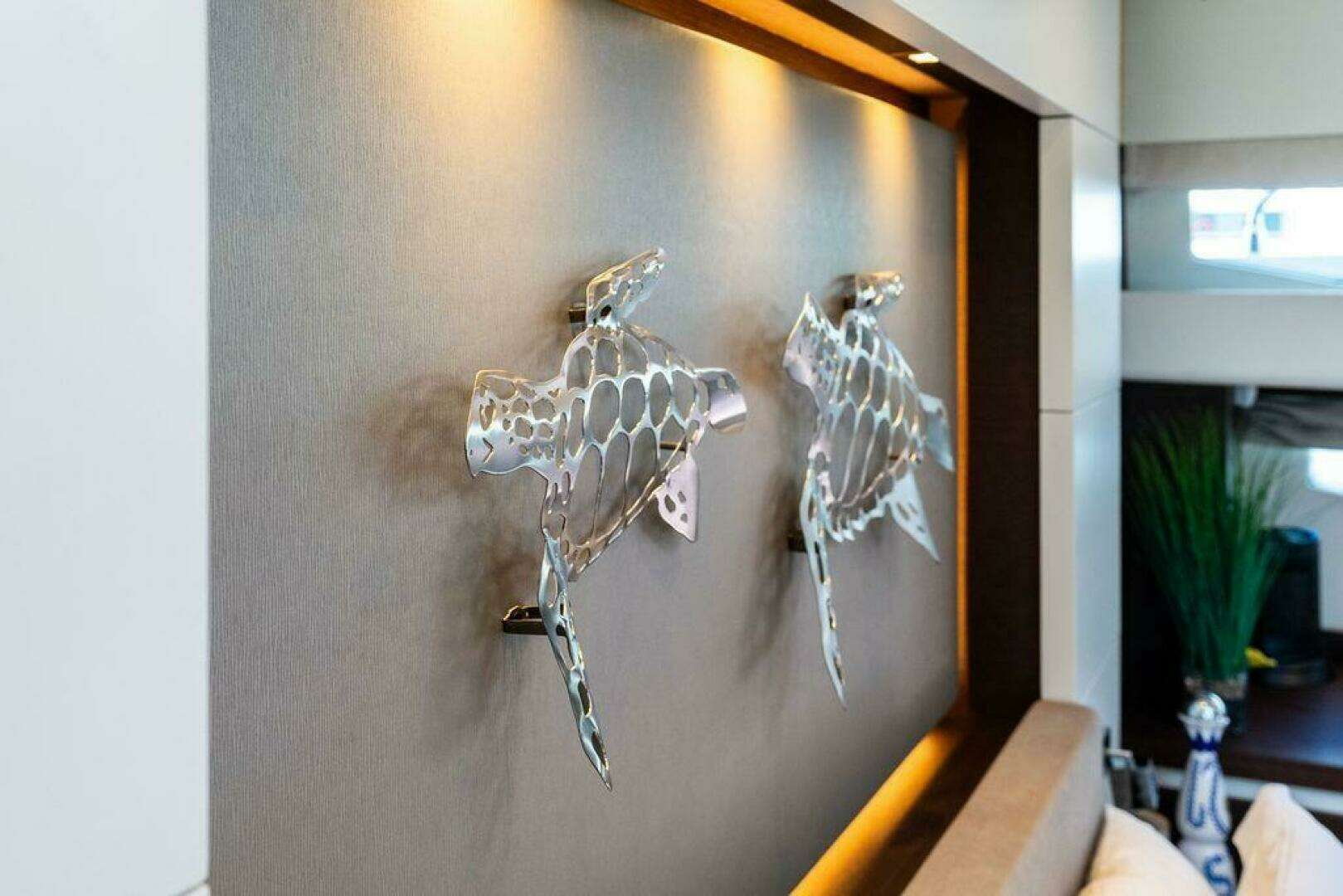 Her layout includes four staterooms, highlighted by a private master, plus separate crew quarters aft, comfortably accommodating eight guests. Expansive salon and dining areas with panoramic windows create a bright, inviting interior, while outdoor living is maximized with multiple lounge and dining spaces across the flybridge, foredeck, and aft deck.