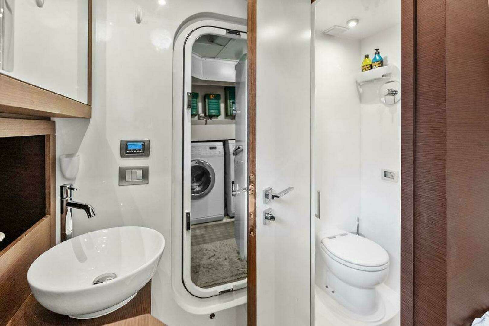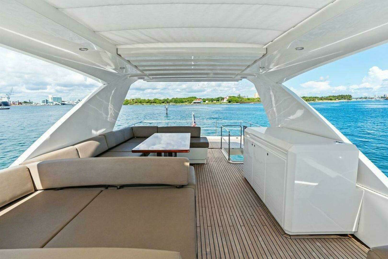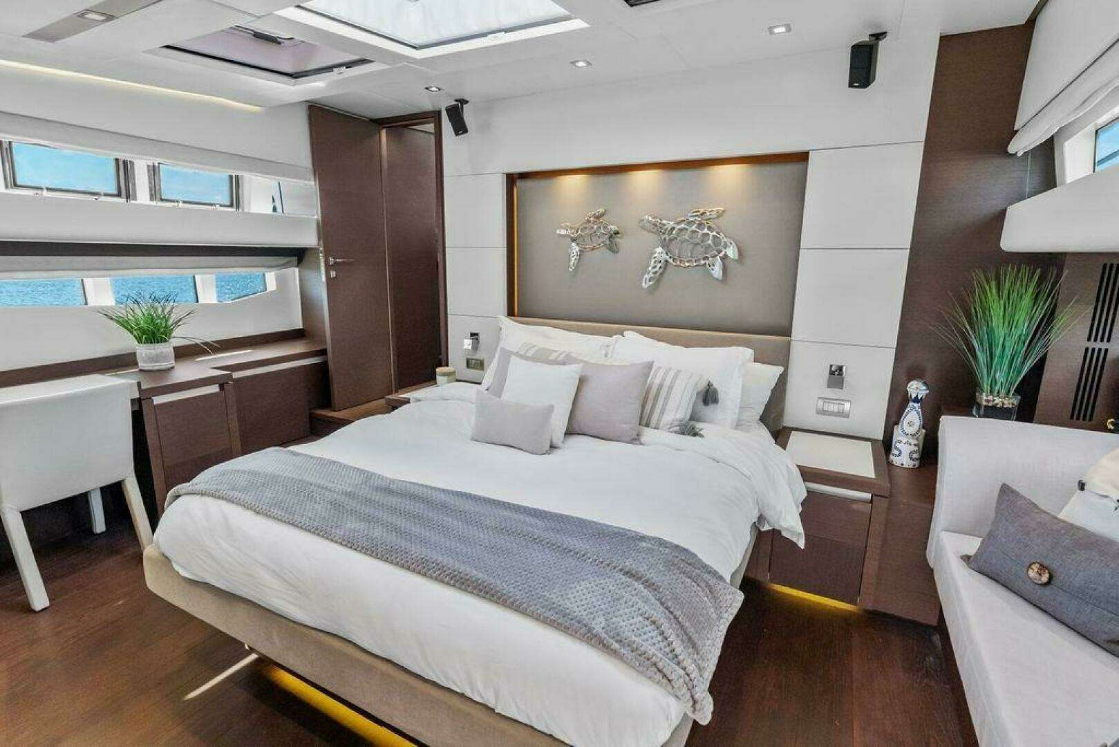 The flybridge features a hardtop with retractable sunroof, wet bar, dining area, and sun loungers, while the foredeck offers a private retreat with seating and a sunpad. Aft, the cockpit provides shaded alfresco dining, and the hydraulic swim platform allows effortless access to the water for tenders and toys.