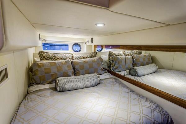 The third cabin features over-under bunks and makes for additional storage if needed. The two guest staterooms share a head with a shower stall.