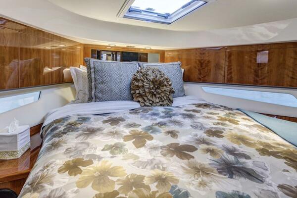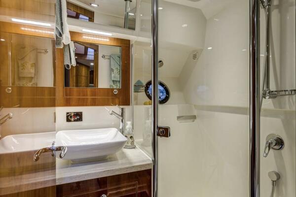 Located aft is the full beam VIP Stateroom with outstanding views from the large windows in the hull. Opening windows bring fresh air. Spacious, extremely comfortable and well laid-out with custom TemperPedic queen-sized mattress. A separate single berth also serves as a couch or day bed. Little touches like the cedar lining, built-in drawers and luxuriously lined under-bed storage show Riviera’s attention to detail in this design.