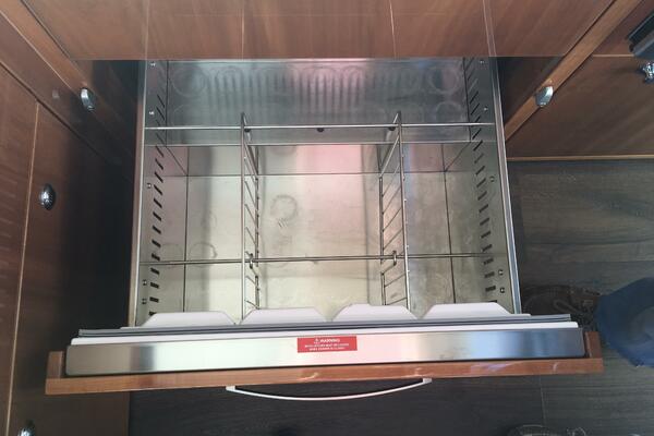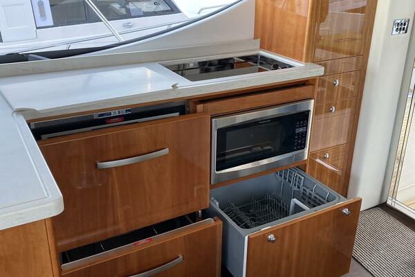 Locating the Galley aft by the rear door not only allows owners to cater to the salon and cockpit with ease, but the chef is always involved with the party. It’s a very substantial galley, with everything from high-quality flooring and solid surface countertops to a pull-out pantry, custom storage drawers for Riviera’s dishware, glassware and flatware, ample storage space, refrigerator/freezer drawers, electric stovetop, Panasonic convection microware (with air fryer and broiler), Franke stainless steel sink and a Fisher Paykel dishwasher. Nearby are 3 more Vitrifrigo refrigerators for plenty of provisions and beverages. The cabinetry is clean and modern in its design. The 360-degree views from the galley are fantastic.