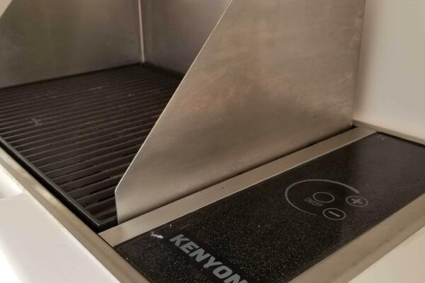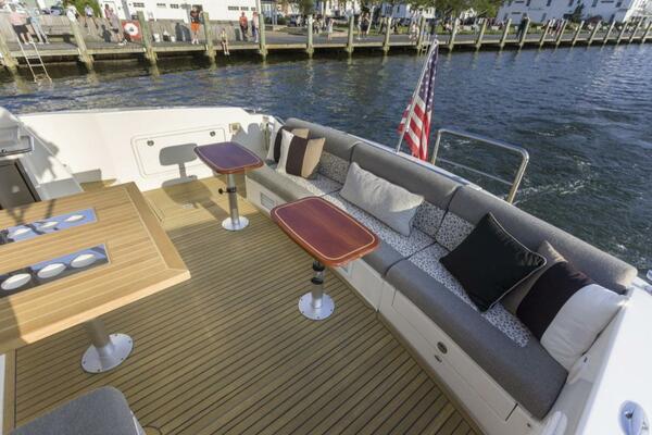 The cockpit offers generous seating under a large Stamoid sunshade. “Pronto” offers a flexible cockpit layout by having either one large dining table at the aft sofa or use the standard dining table at the L-shape settee plus two small cocktail tables for the aft sofa. Cockpit seats and bow sun pads were reupholstered in 2023 ($20,000). Enjoy entertaining with the Kenyon electric barbecue, the two optional refrigerators and swimming from a teak-laid swim platform that raises and lowers at the touch of a button – a feature that comes in particularly handy for launching the 2016 Brig F300 tender with a 20 HP Honda outboard that is neatly garaged out of sight. The owner added custom rollers in the tender garage for launching and retrieving the tender. The optional, stainless steel transom railing adds safety on the swim platform. Underwater lights and LED-illuminated “Pronto” sign add nighttime ambiance. The swim platform can carry a jet ski with its 875 lbs capacity.