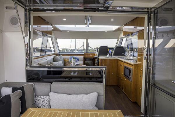 The salon is on the same level as the cockpit making for a seamless transition between indoors and outdoors. Large picture windows frame the views. The door and rear window open to unite the salon and cockpit into a great room. A huge leather lounge can seat eight at a folding dining table and there is a flatscreen satellite television connected to a Bose Lifestyle system. Above, the sunroof opens at the press of a button. Or run the generator and the optional Tropical air-conditioning in the salon for total climate control with the door and windows open.