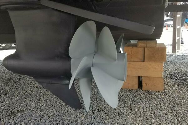 The underwater profile of the Riviera 5000 Sport Yacht includes two Zeus drive units with aft-facing counter-rotating propellers with underwater exhausts. The drives are mounted in tunnels that protect the pod drives from underwater debris.