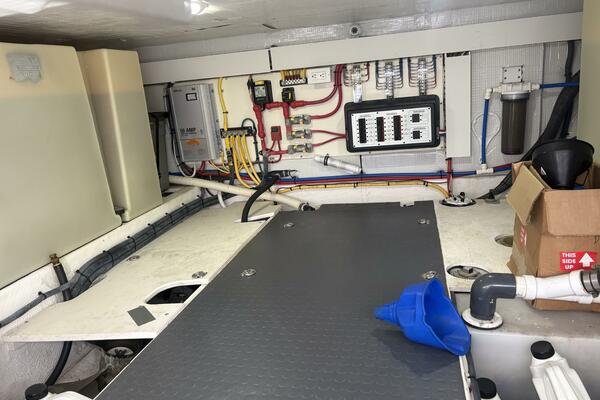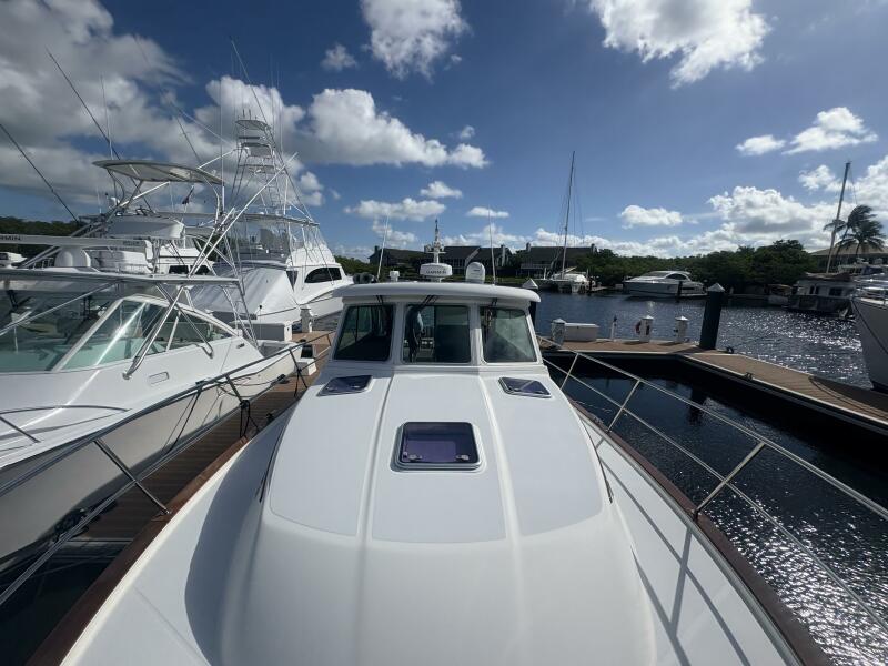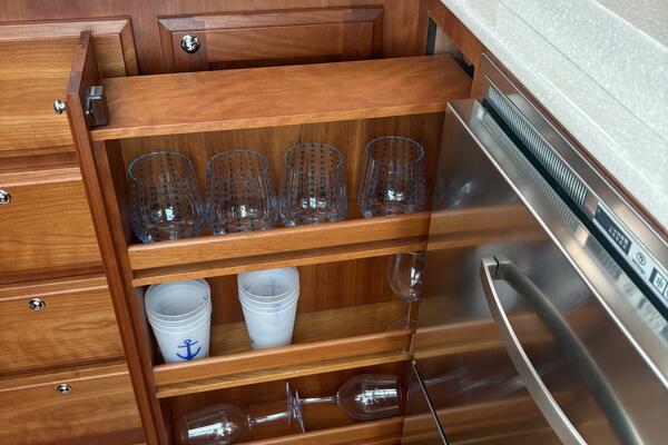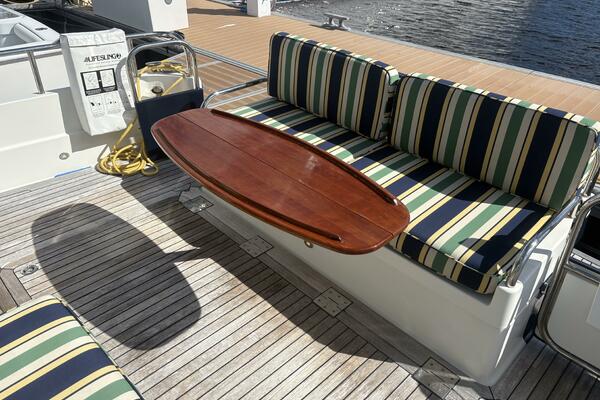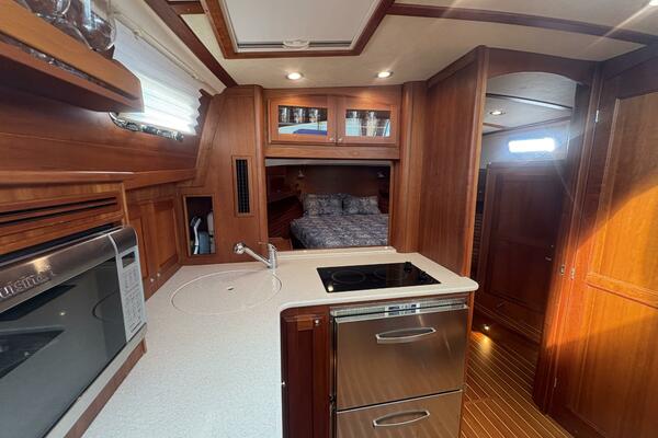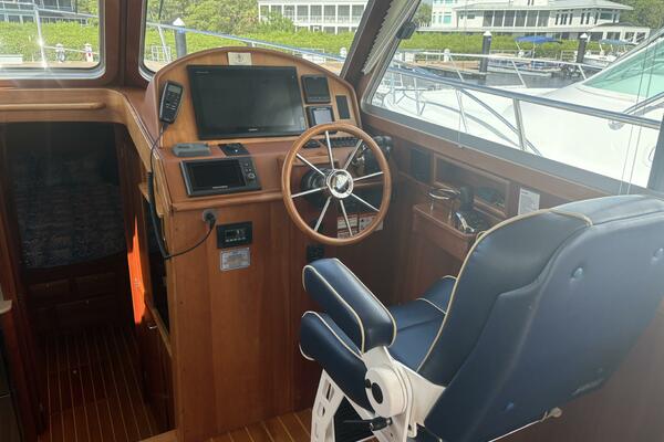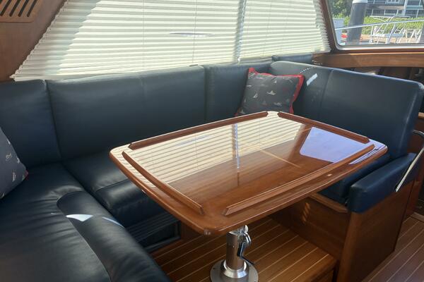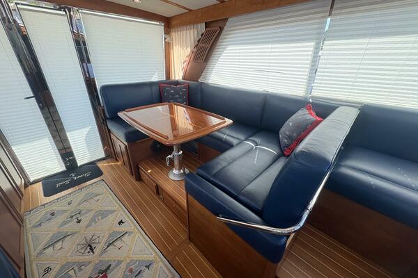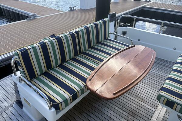 In her main salon a large, U-shaped settee with fold over table will seat up to three couples, while the forward end of the settee can be oriented forward to provide a comfortable perch when underway. To starboard, aft of the Stidd helm seat, is a long cabinet housing an LED television on an electric lift and storage compartments for the owners gear.