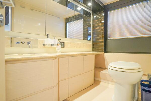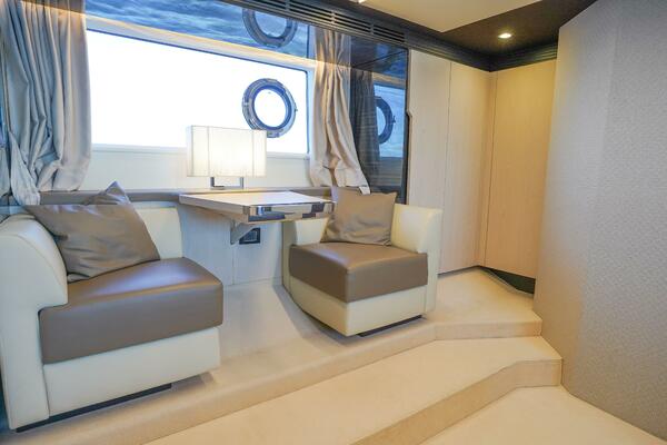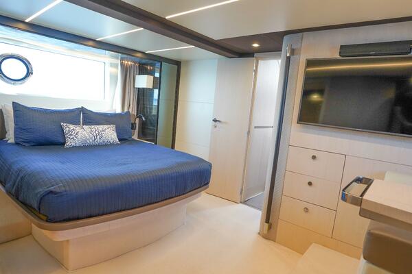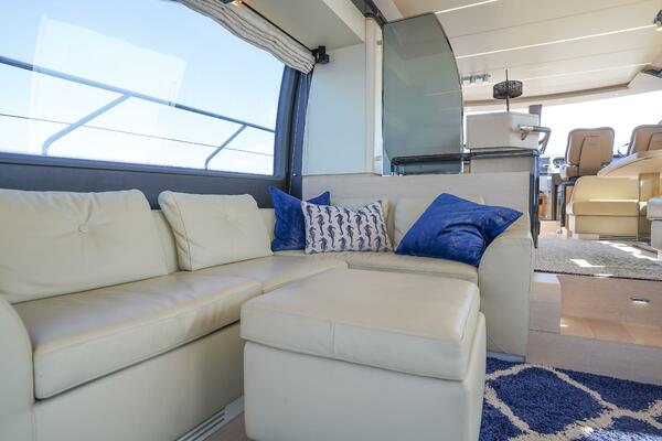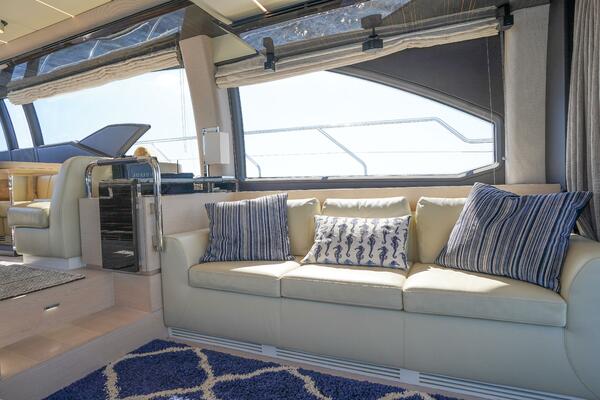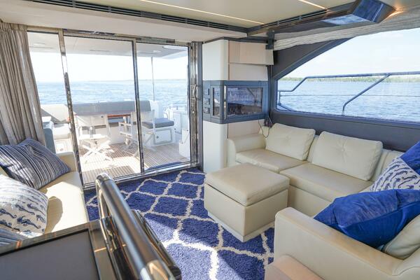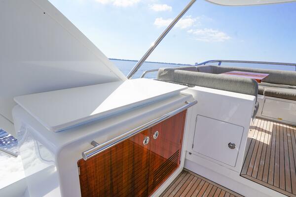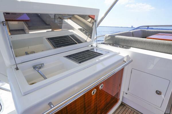 Her expansive flybridge, the largest in its class at over 300 square feet, offers three distinct entertainment areas with a wet bar, grill, dining space, and sun loungers—all under a hardtop with a retractable sunroof. Perfect for social gatherings or relaxing at anchor.