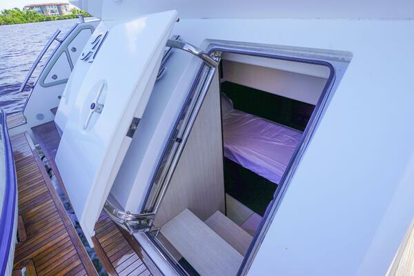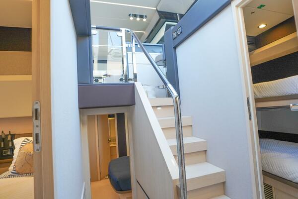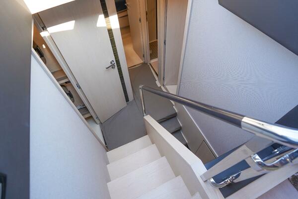 - Access from cockpit via GRP stairway with teak steps (port side)