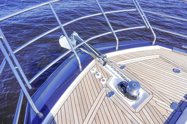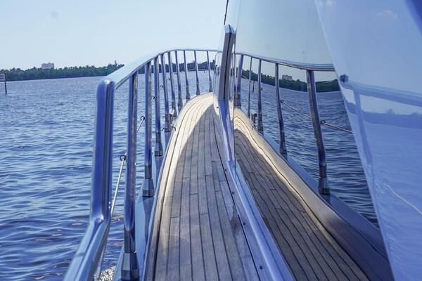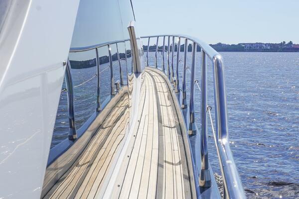 - Full teak decking (cockpit, flybridge, side decks, platform)