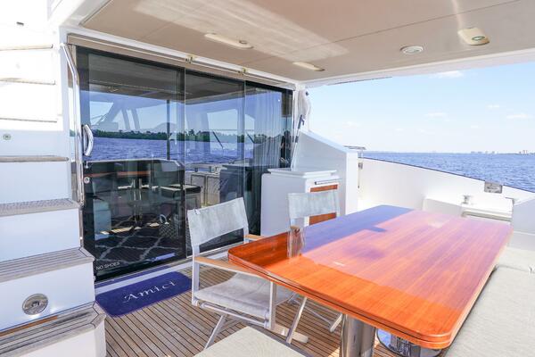 Inside, Amici offers a bright, open salon surrounded by panoramic windows, with plush seating, elegant finishes, and seamless flow to the formal dining area and fully equipped galley with bar seating, wine cooler, and privacy glass. The lower helm features excellent visibility and advanced navigation systems.