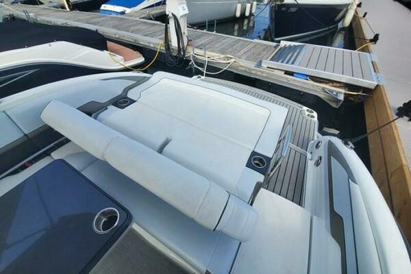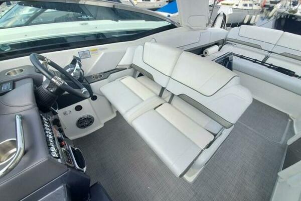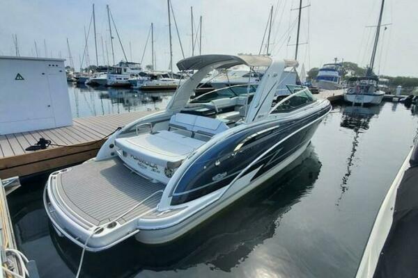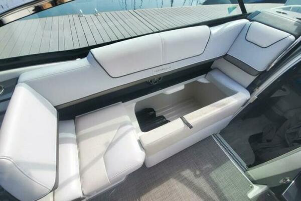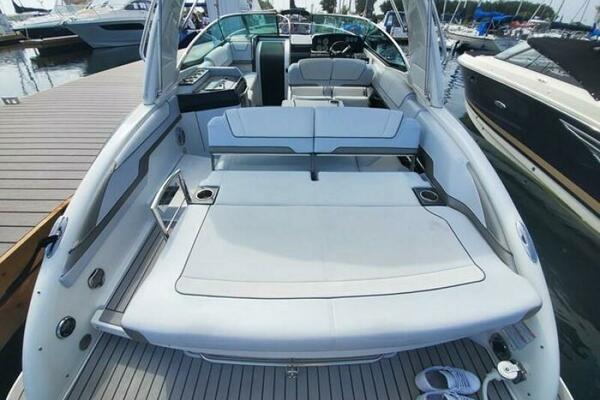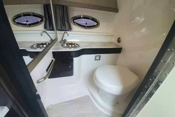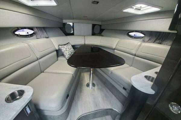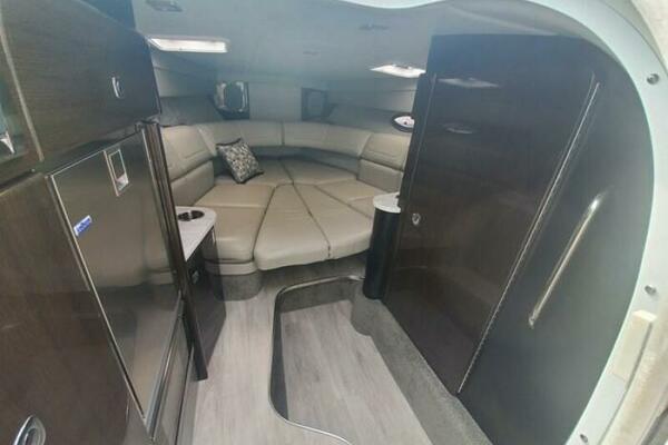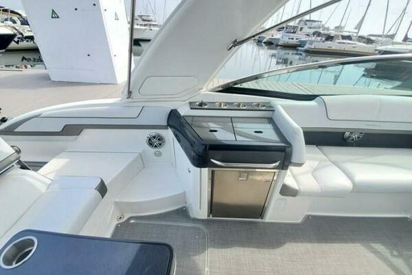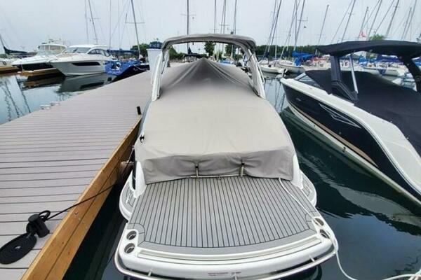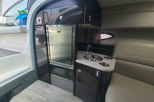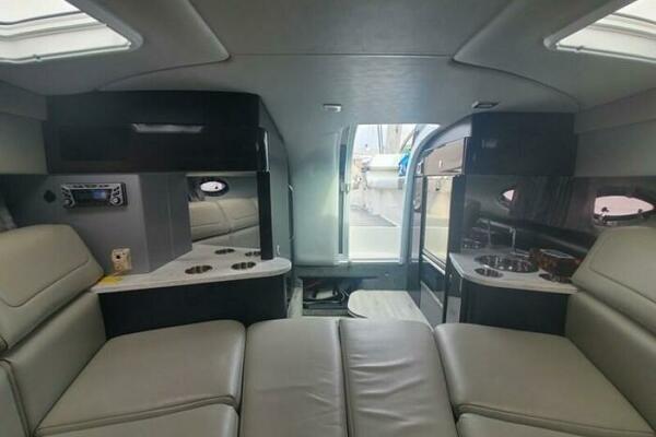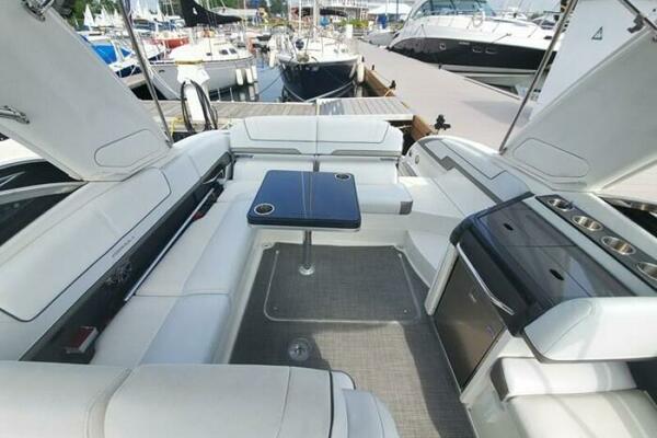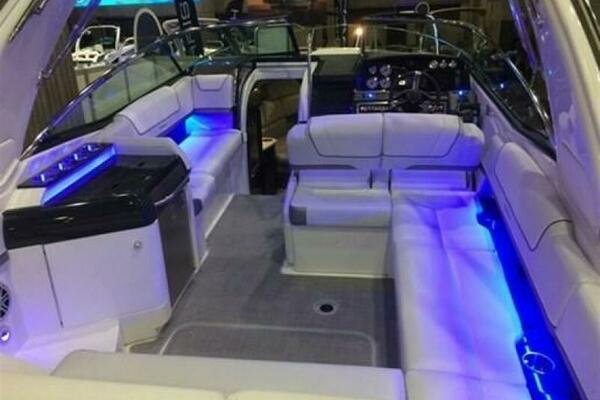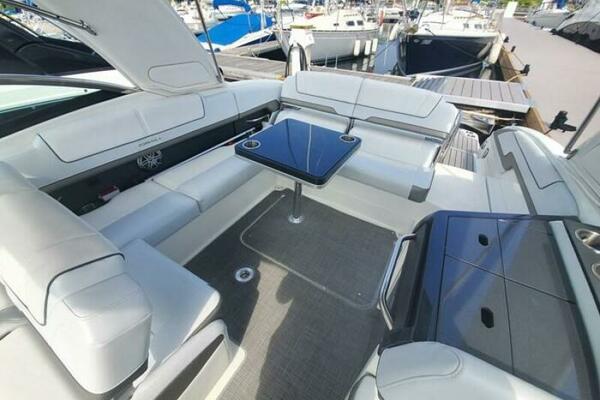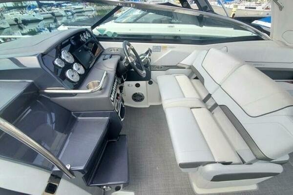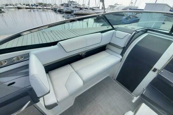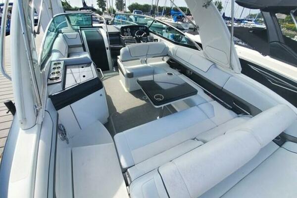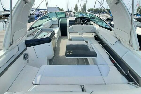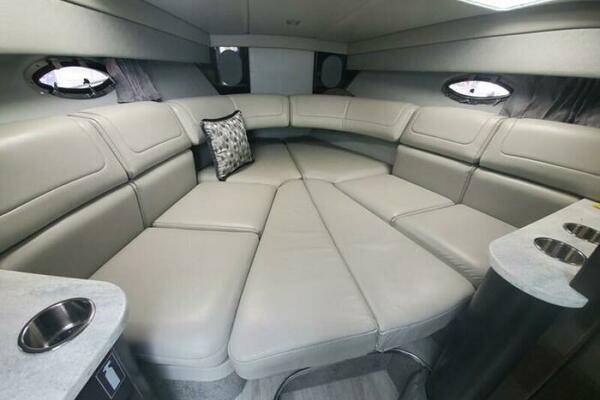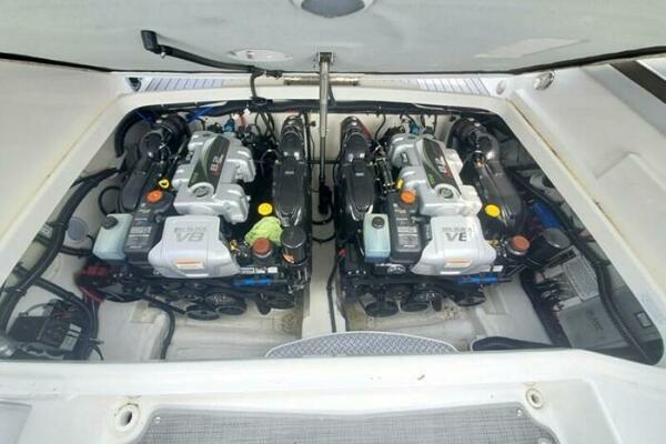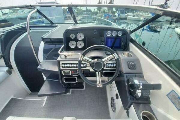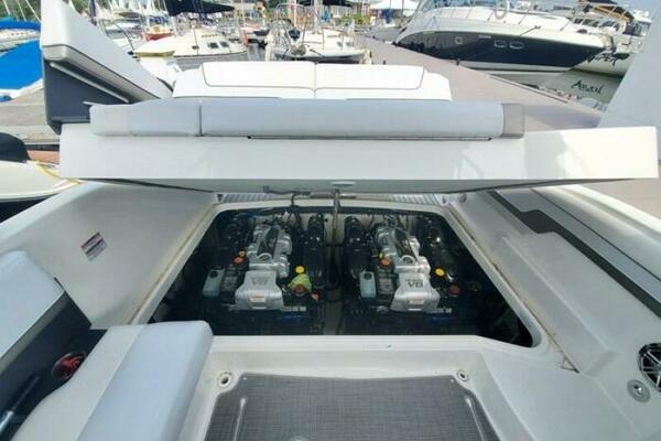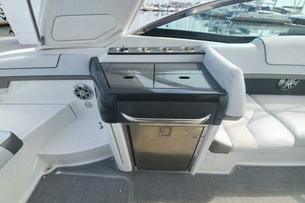 When you step aboard the integrated swim platform with teak vinyl decking you can feel the quality beneath your feet. The cockpit is open and inviting for a long cruise or a quick run to dinner. The cockpit with portside lounge, double-wide helm seat and U-Shape seating aft creates the perfect conversation and lounging environment. A large aft sun lounge with adjustable backrest. V-berth, head and galley can accommodate for longer trips. One owner boat equipped with powerful dual Mercruiser 8.2 MAG V8s.