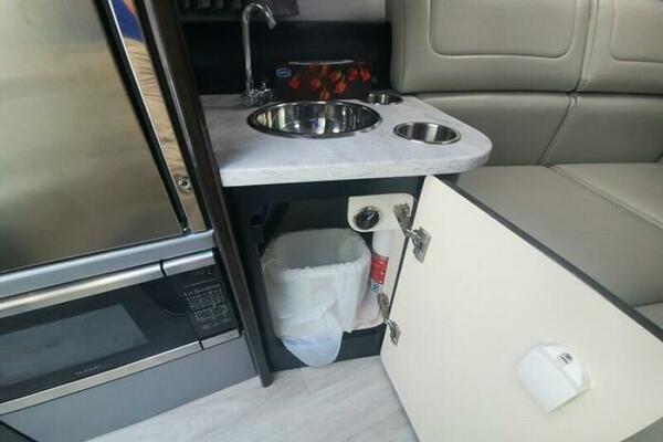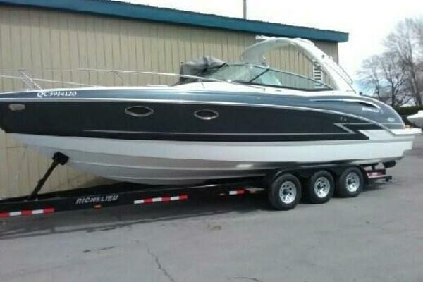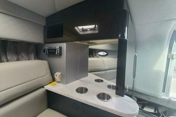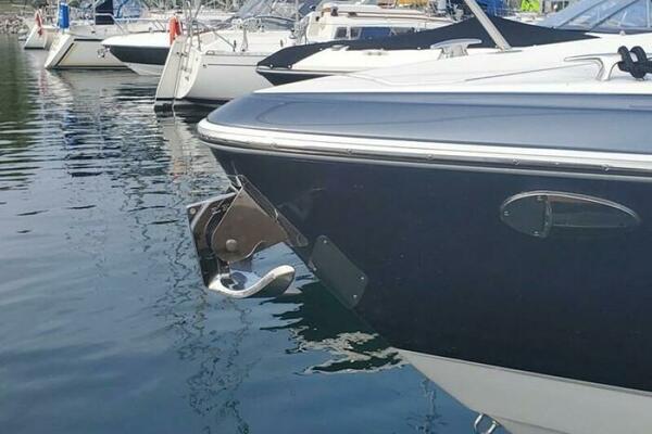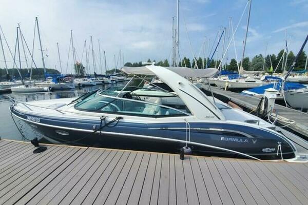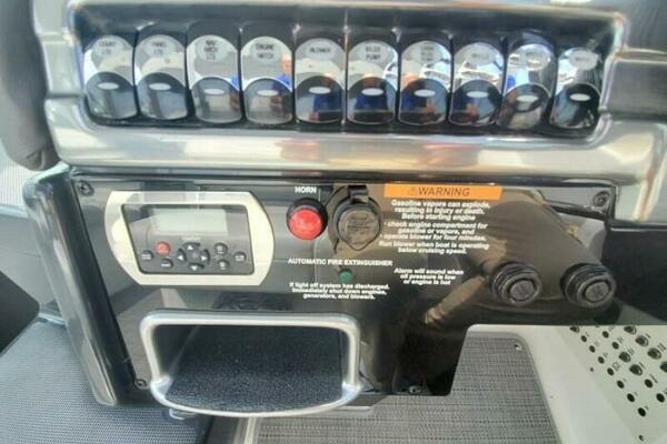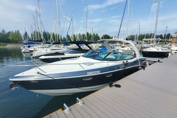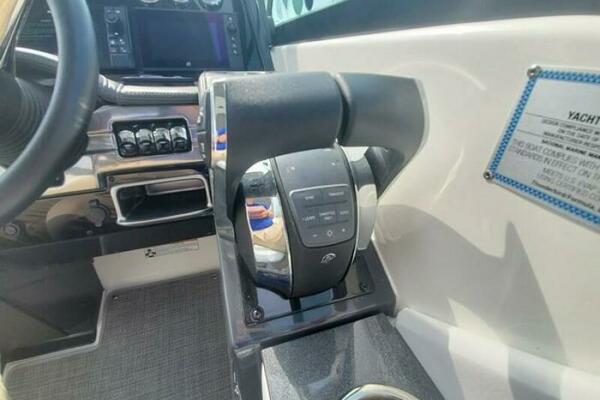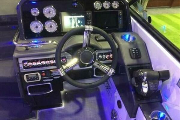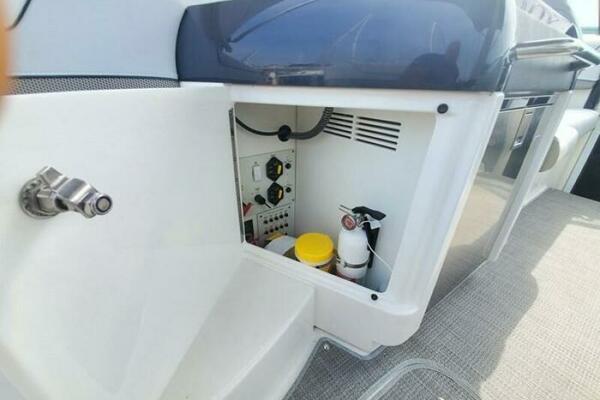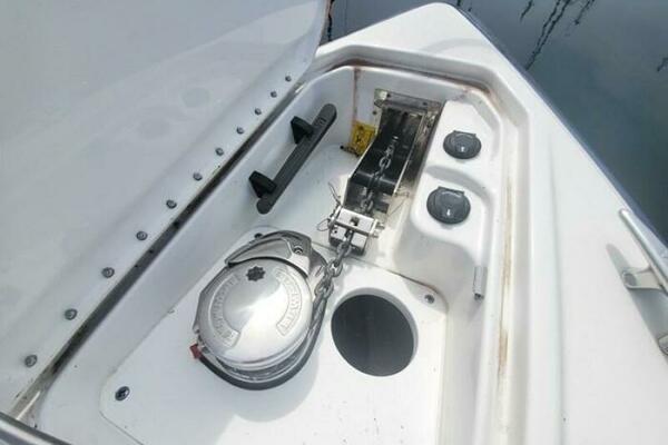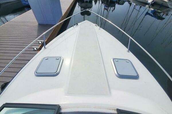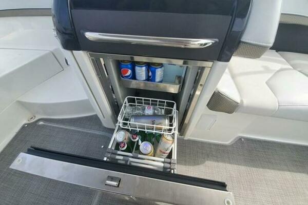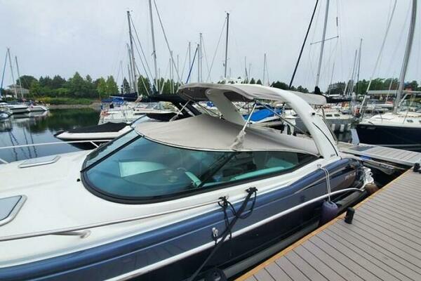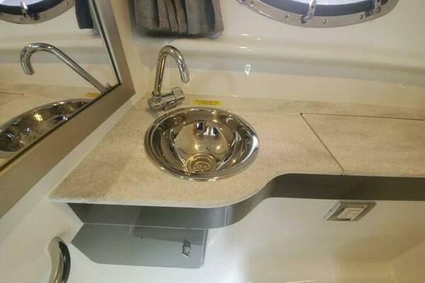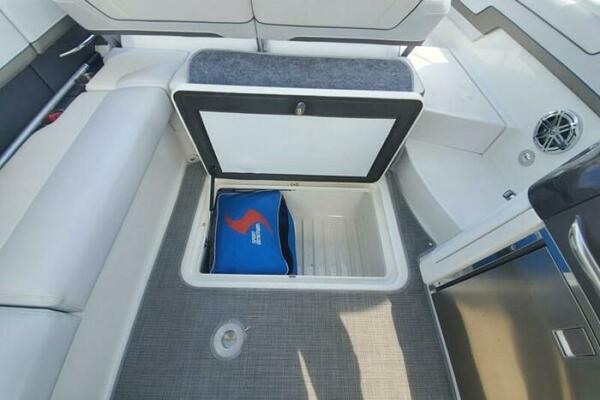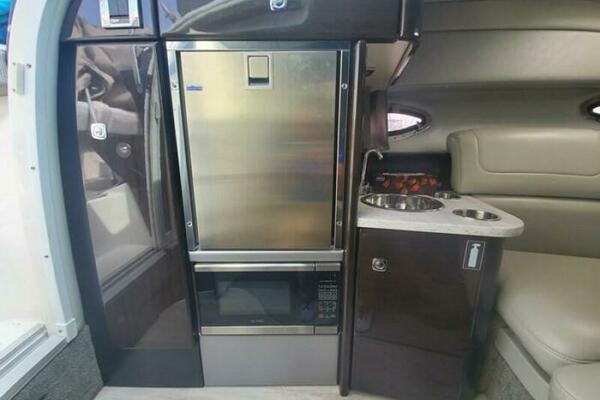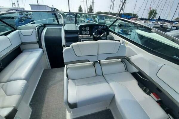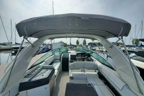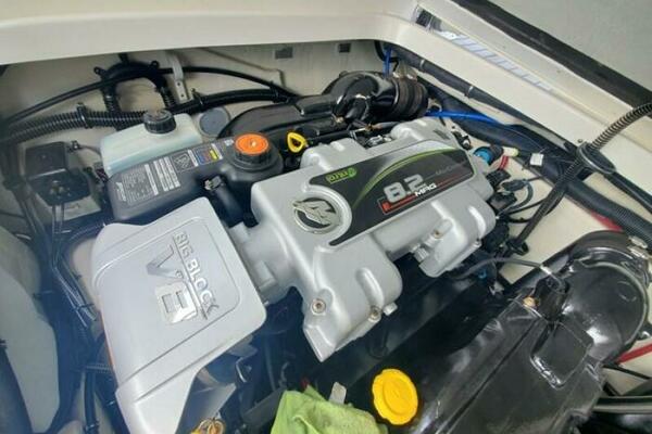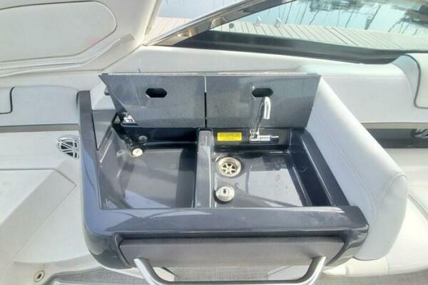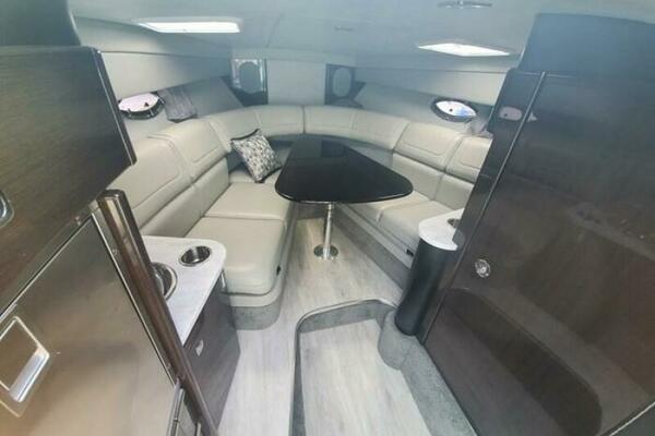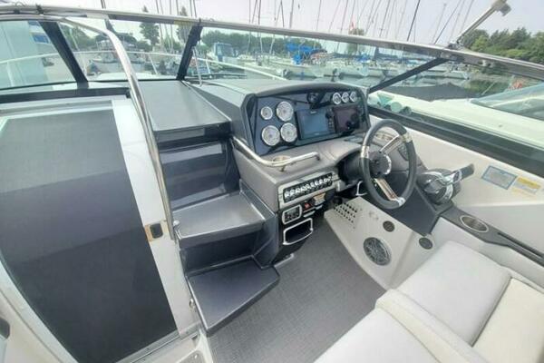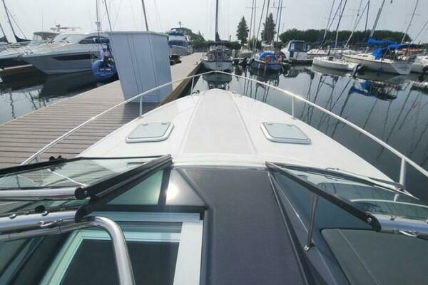 When you step aboard the integrated swim platform with teak vinyl decking you can feel the quality beneath your feet. The cockpit is open and inviting for a long cruise or a quick run to dinner. The cockpit with portside lounge, double-wide helm seat and U-Shape seating aft creates the perfect conversation and lounging environment. A large aft sun lounge with adjustable backrest. V-berth, head and galley can accommodate for longer trips. One owner boat equipped with powerful dual Mercruiser 8.2 MAG V8s.