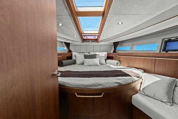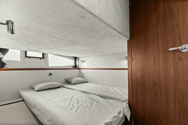 A pair of single berths mounted to the deck athwartships. Each berth is 6’4” (1.93 m) long and 2’6” (76.2 cm) wide, with 1’2” (35.6 cm) between them when separated completely. Each is mounted to a track that can slide the berths together to create one large berth -- the best such system for this kind of setup we’ve yet seen. The berths have 2’7” (78.7 cm) of headroom above them, and the bulkheads and overhead are upholstered in Alcantara suede.