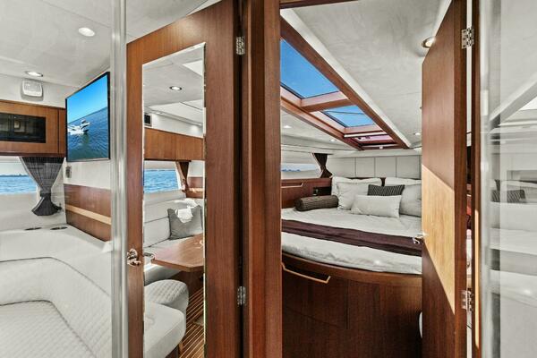 One of the key missions for this boat was clearly natural light -- sun roof at the helm, skylights in the staterooms and master head shower, the large hullside windows below deck and the huge, single-piece windshield bring the sunshine indoors while keeping guests protected from the elements.