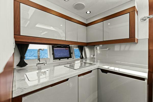 The galley is to starboard and includes overhead storage, with one of these compartments housing the microwave. There is a two-burner electric stove, double-basin stainless steel sink surrounded by Corian countertop. The sink has a cover to create more counterspace, and the cover itself has dedicated storage space just behind the faucet.
