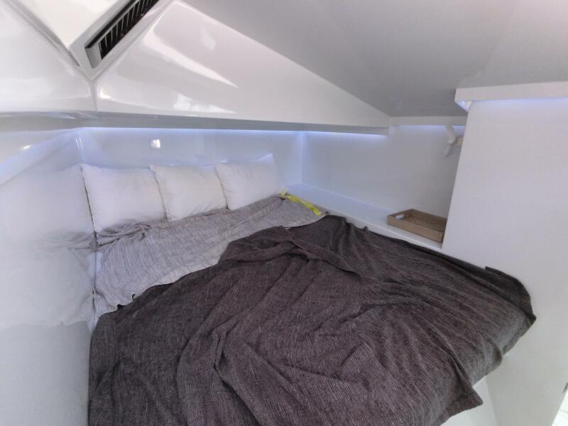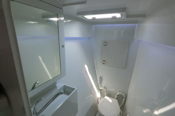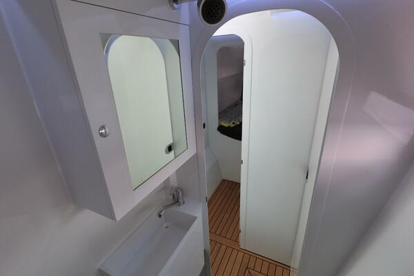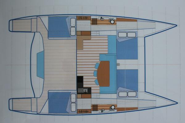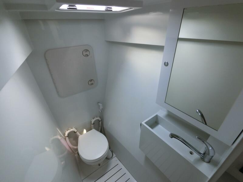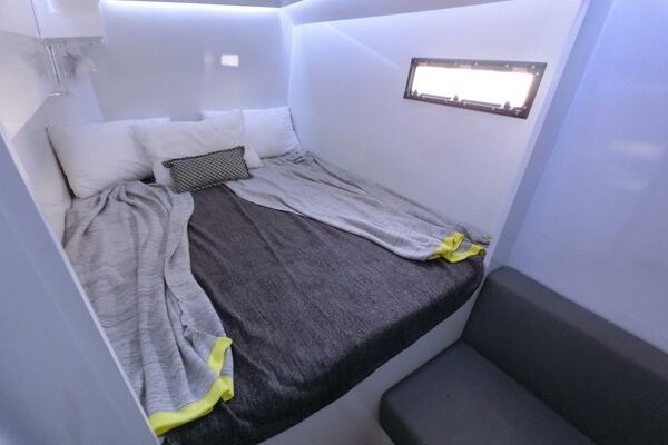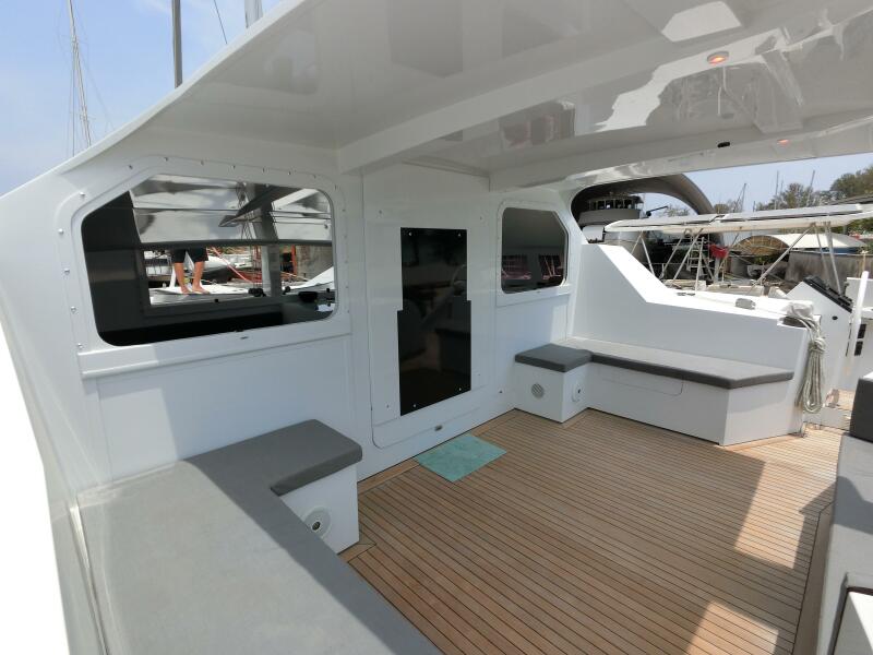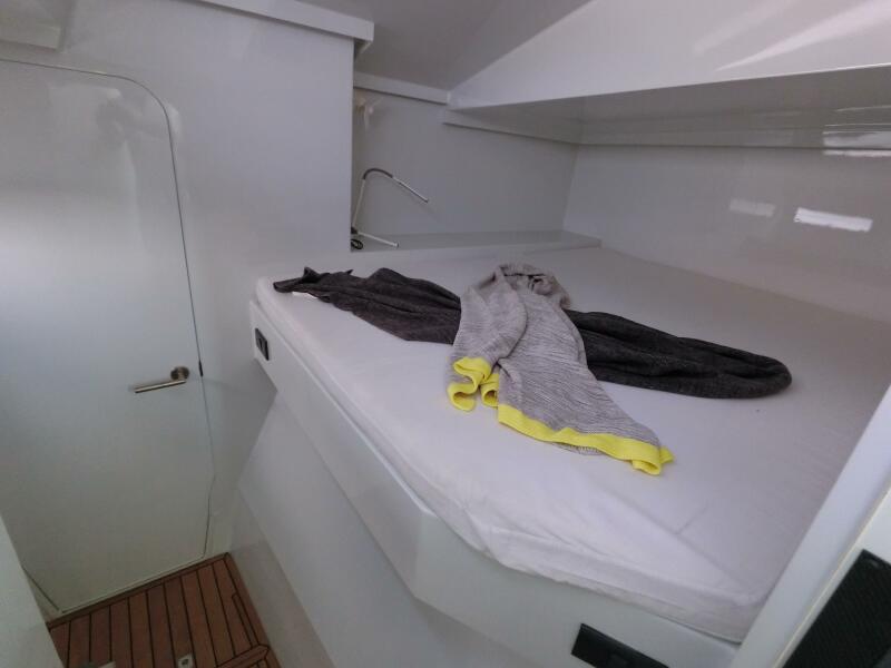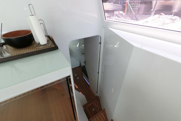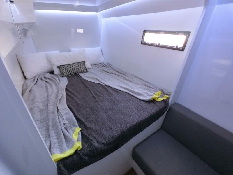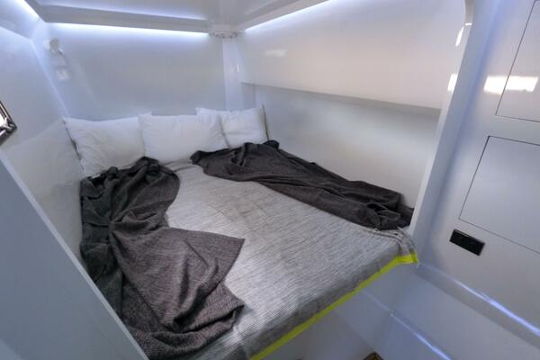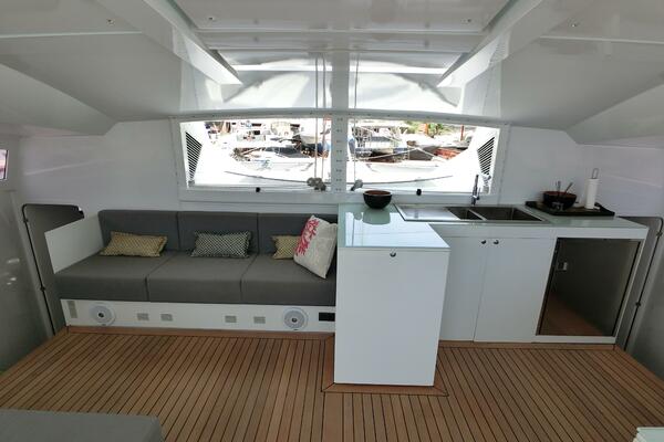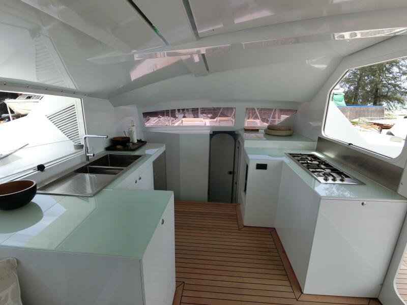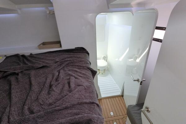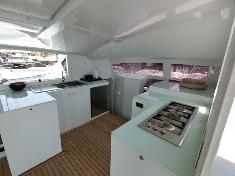 The nearly full-width saloon and galley feature innovative drop-down front windows, allowing a refreshing breeze to flow through even on the hottest days. Alternatively, close up and enjoy the comfort of full air conditioning. The well-designed galley to starboard includes deep slide-out drawers, ample storage and excellent refrigeration, with additional fridge/freezer space to port for longer passages.