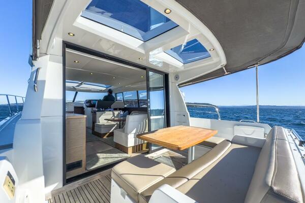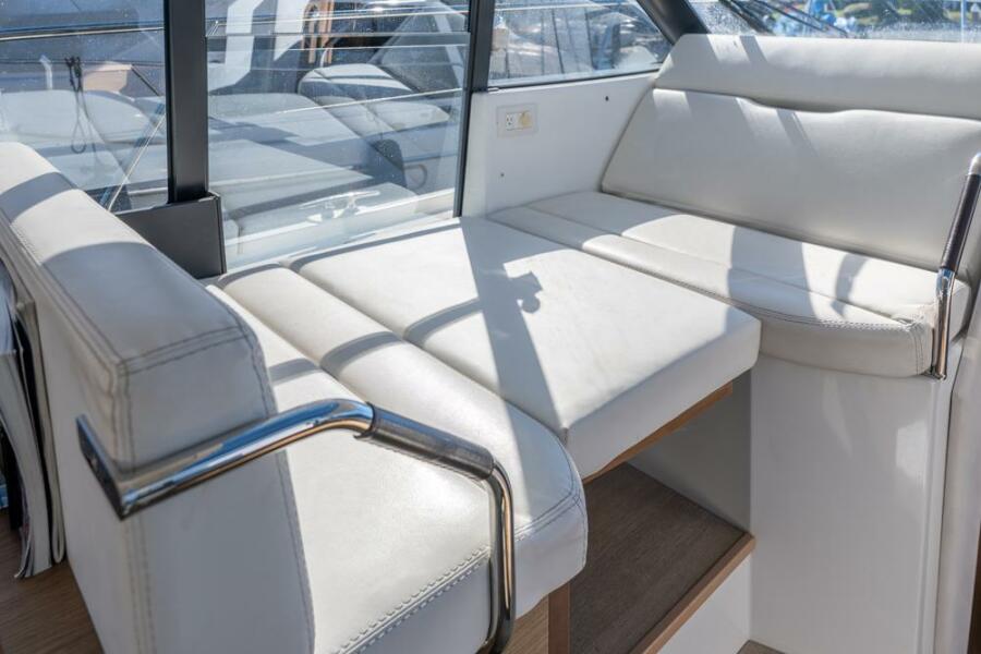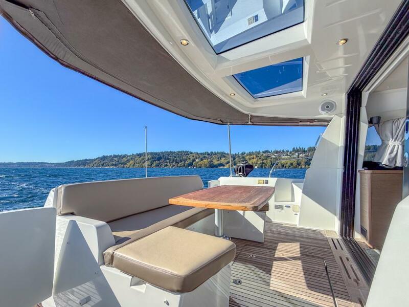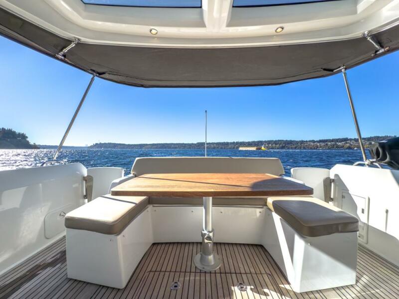 - Newly upholstered aft deck seating with table that drops to be a sunbed. Note: seating moves forward and aft to give you more room on the aft deck