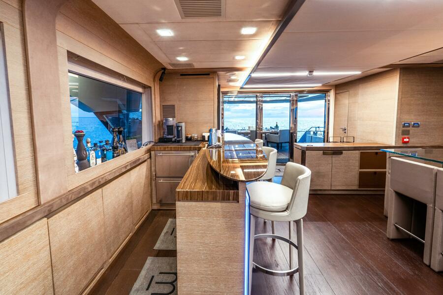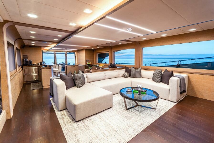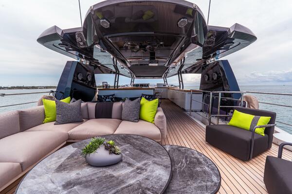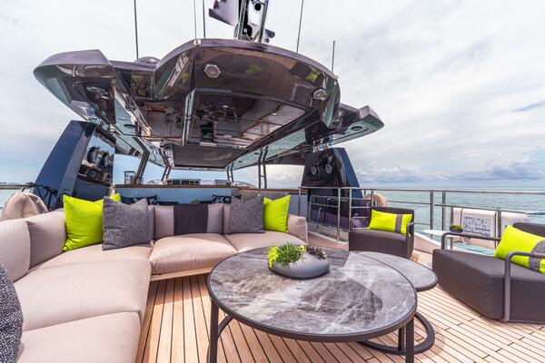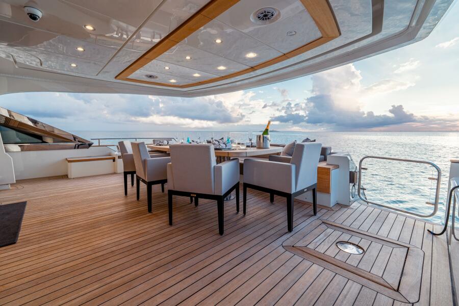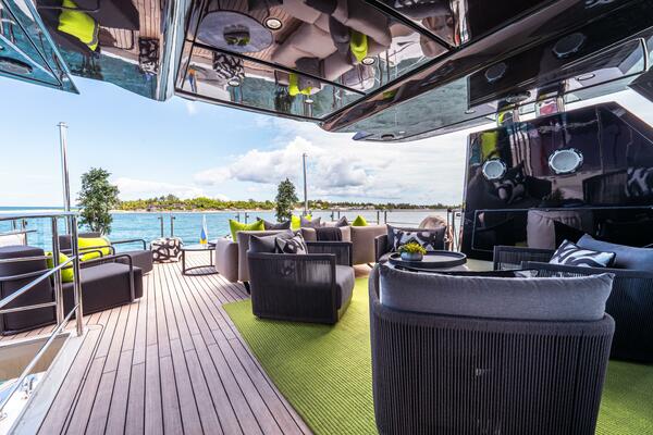 At the heart of her outdoor experience lies an expansive 70-square-meter flybridge, sheltered by a retractable 6-meter carbon fiber T-top. This space is more than just open air, it has three distict zones- a formal dining setup with a large round table for up to 12 guests with a galley/bbq a few steps away, a covered seating area with four chairs, and all the way aft there is another area with a sofa and sunloungers. It's a true upper-deck retreat, perfect for entertaining under the sun or stars.
