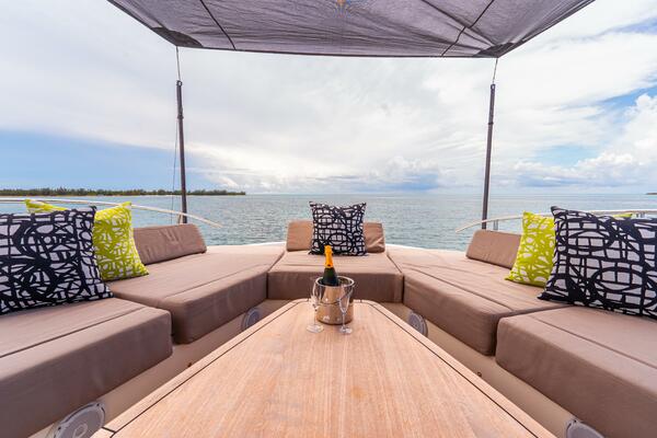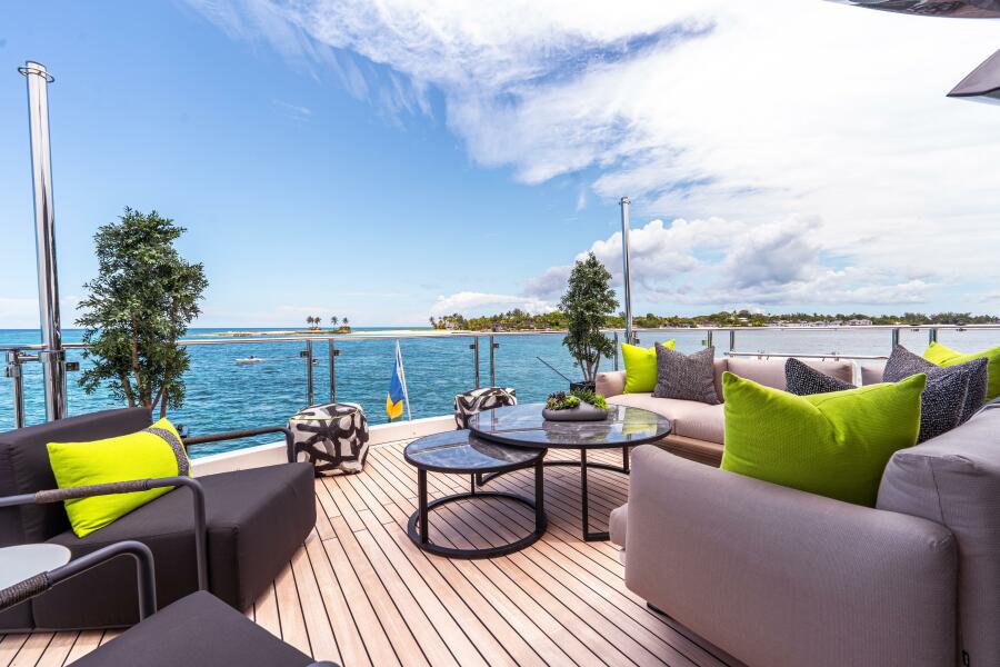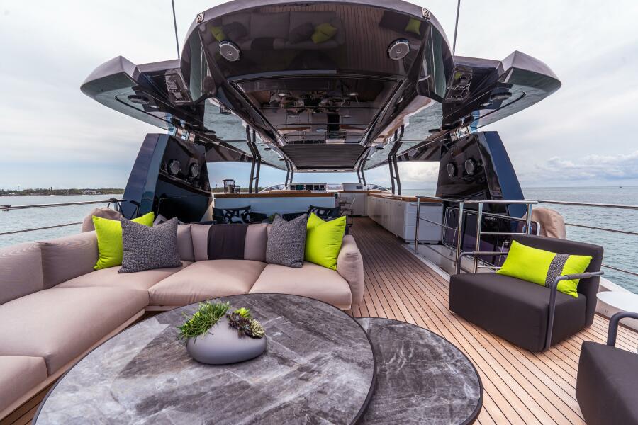 - Sunpads, backrests, cushions and cocktail tables for the sunbathing area in aft flybridge