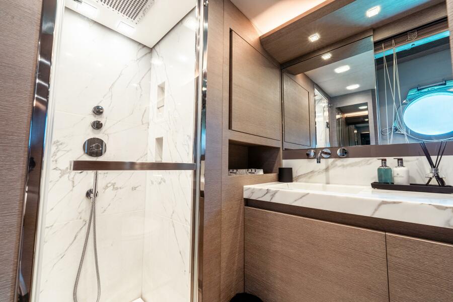 A particularly innovative layout decision is the relocation of the galley to the lower deck, freeing up the main deck for expansive lounging and dining areas. The full-beam owner's suite, accessed via a private starboard passageway, is a two-level retreat that feels more like a boutique apartment than a stateroom.