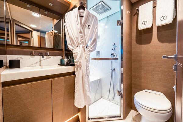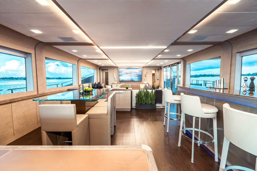 Inside, the MCY 105 doesn't shout, it whispers luxury. The use of hand-finished teak and oak in soft, natural shades evolves a sense of calm. The palette is rich yet restrained, creating an ambiance that's both welcoming and sophisticated.