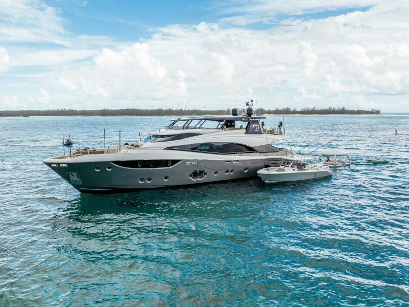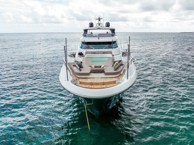 All the way aft you find a garage that currently holds a 2024 AB Jet 390 XP tender and a seadoo. The garage can also accommodate a larger 4.5m Williams tender if a larger tender is preferred. A few steps down from the garage is one of the largest retractable swim platforms you will find on a 105'.