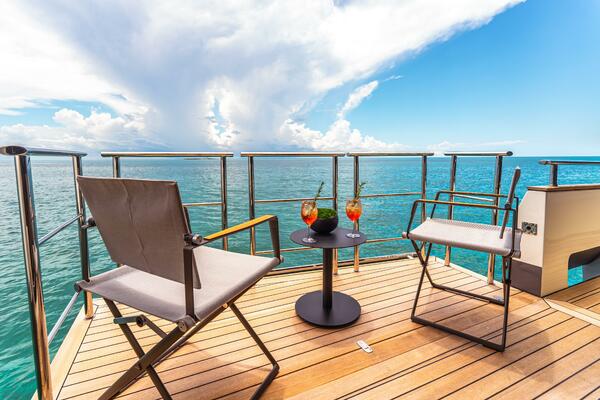 Forward, the Portuguese bridge leads to a thoughtfully designed foredeck lounge that is ideal for escaping from a busy aft deck. With a large sofa, jacuzzi, twin sunpads and a theatre that can be set up for watching movies, this elevated space invites serenity and sea views in complete privacy.