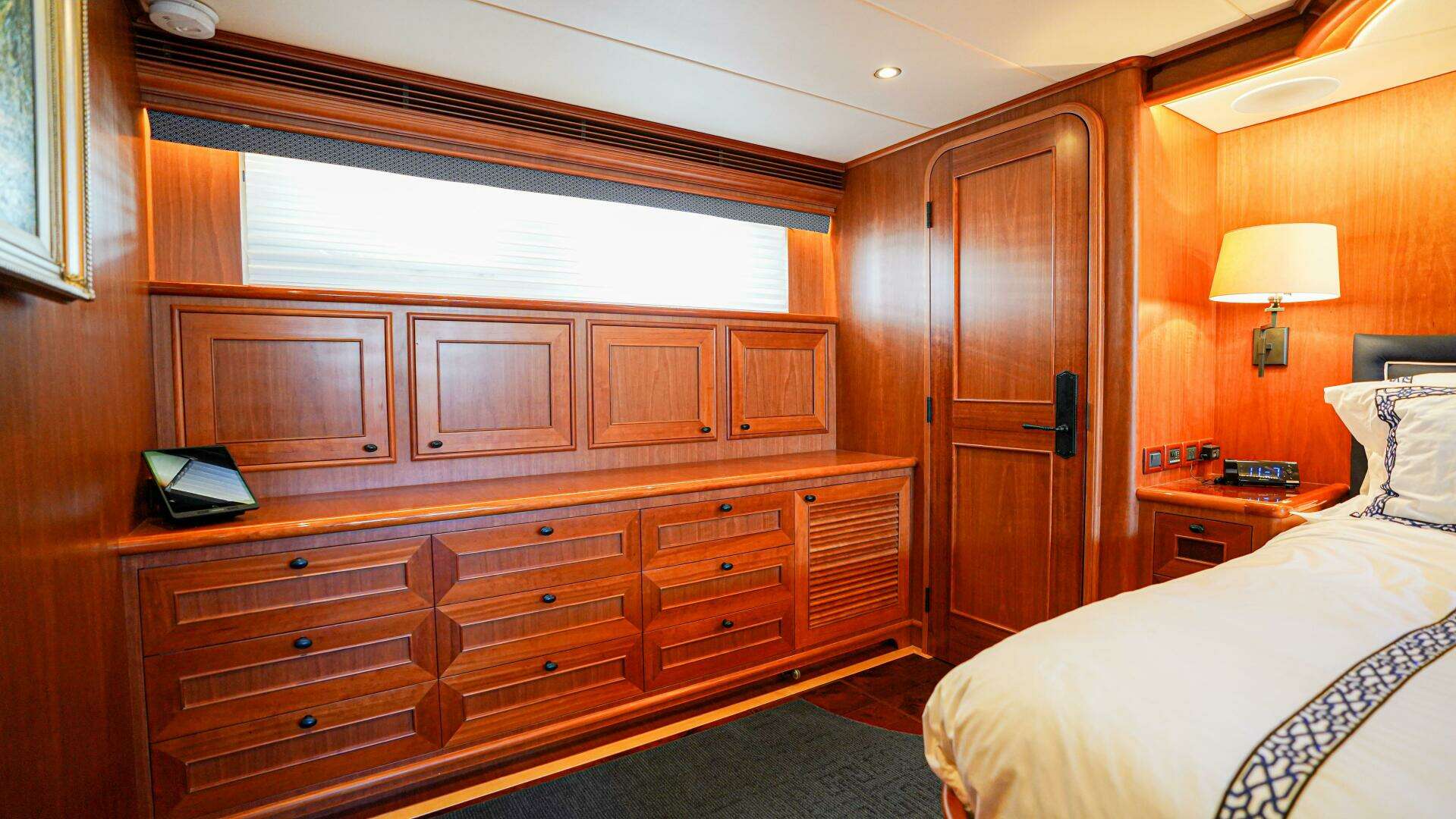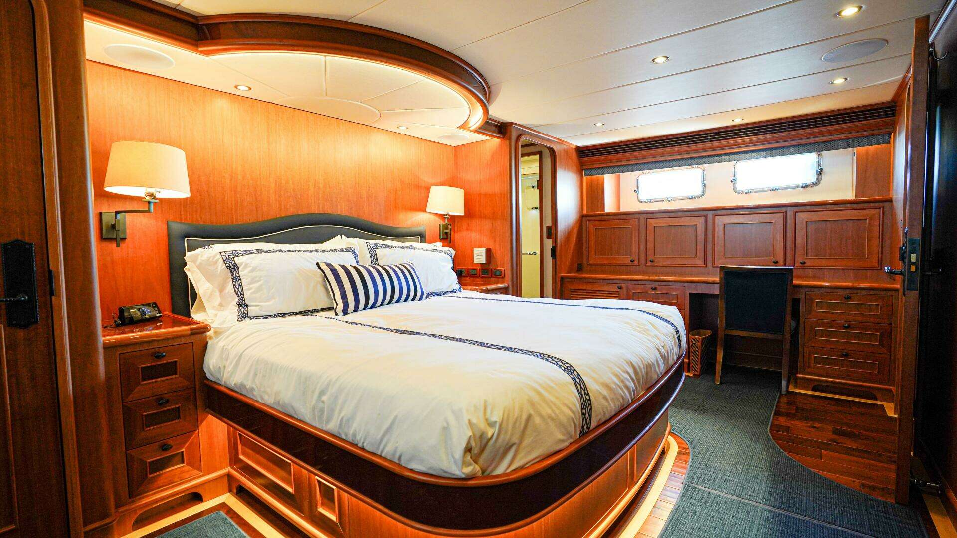 - Starboard captain's crew cabin with one (1) queen berth with a custom mattress with storage drawers underneathwith burl on berth surround