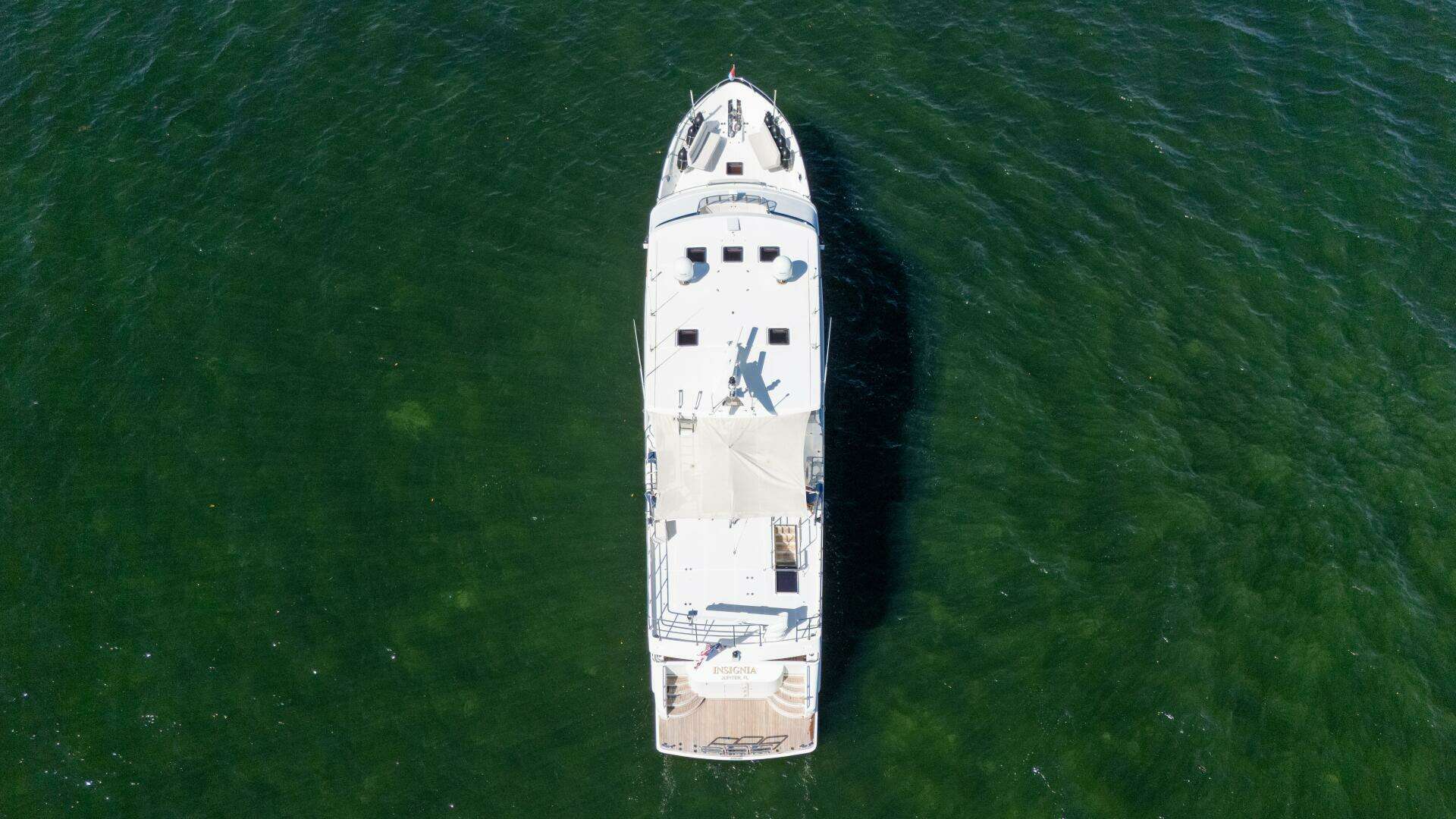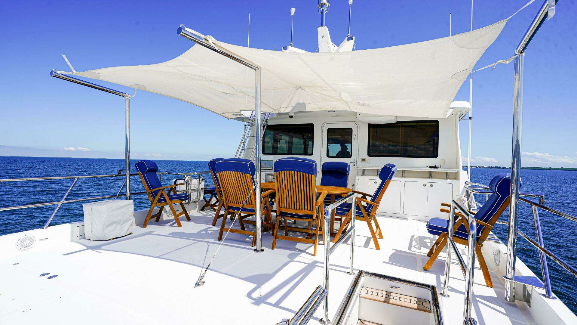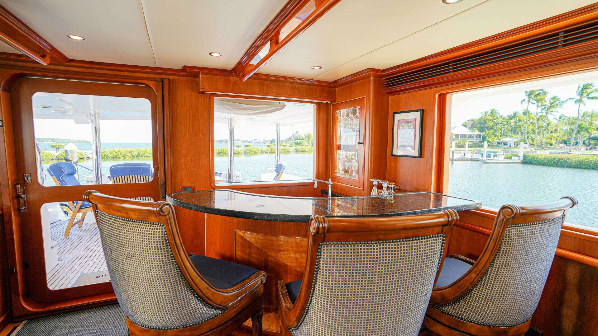 From the moment you step aboard INSIGNIA, it’s clear she was originally commissioned by an exceptionally knowledgeable and detail-oriented owner. Her spacious aft deck sets the tone, featuring a large teak dining table with matching chairs, perfect for alfresco entertaining. To port, a built-in cabinet houses an air-conditioning unit, custom storage, and a granite countertop, while a fiberglass staircase provides safe, easy access to the boat deck above.